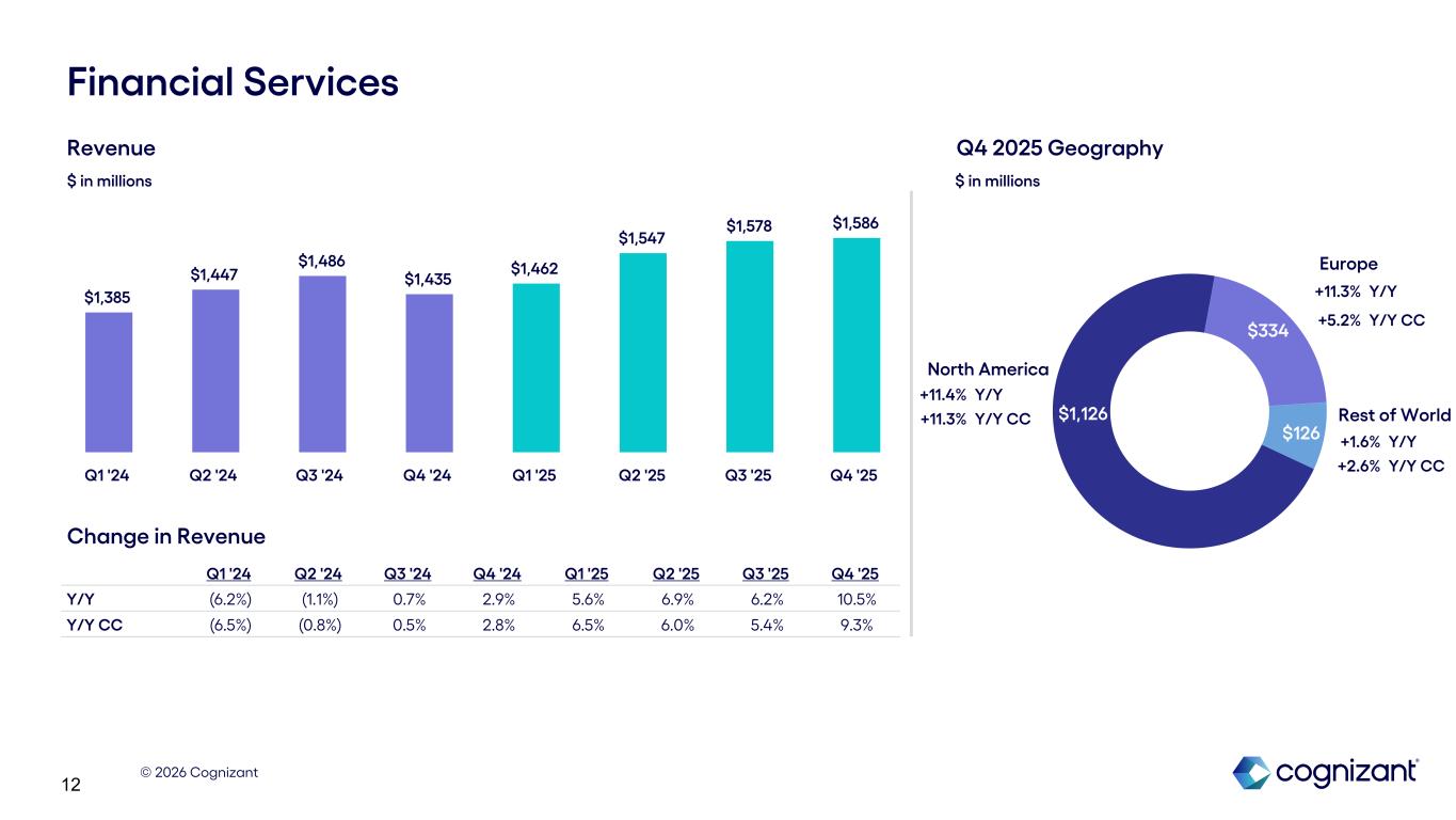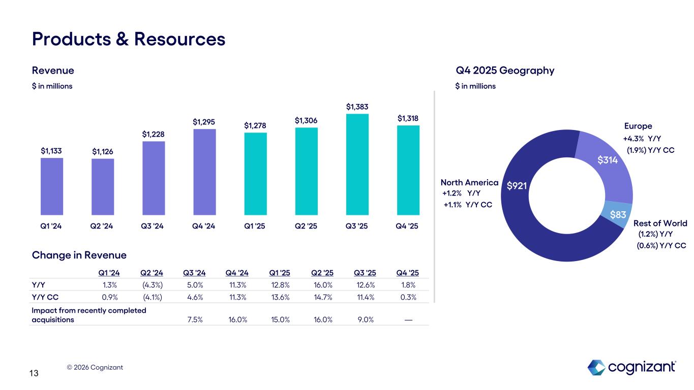 © 2026 Cognizant 12 $1,126 $334 $126 Financial Services North America Europe Rest of World Q1 '24 Q2 '24 Q3 '24 Q4 '24 Q1 '25 Q2 '25 Q3 '25 Q4 '25 Y/Y (6.2%) (1.1%) 0.7% 2.9% 5.6% 6.9% 6.2% 10.5% Y/Y CC (6.5%) (0.8%) 0.5% 2.8% 6.5% 6.0% 5.4% 9.3% +1.6% Y/Y +2.6% Y/Y CC +11.3% Y/Y +5.2% Y/Y CC Revenue Change in Revenue $ in millions $ in millions Q4 2025 Geography +11.4% Y/Y +11.3% Y/Y CC $1,385 $1,447 $1,486 $1,435 $1,462 $1,547 $1,578 $1,586 Q1 '24 Q2 '24 Q3 '24 Q4 '24 Q1 '25 Q2 '25 Q3 '25 Q4 '25