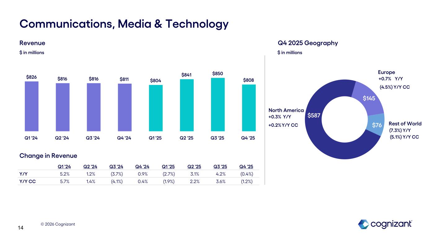 © 2026 Cognizant 13 $921 $314 $83 North America Europe Products & Resources +1.2% Y/Y +1.1% Y/Y CC +4.3% Y/Y (1.9%) Y/Y CC (1.2%) Y/Y (0.6%) Y/Y CC Rest of World Revenue $ in millions Q1 '24 Q2 '24 Q3 '24 Q4 '24 Q1 '25 Q2 '25 Q3 '25 Q4 '25 Y/Y 1.3% (4.3%) 5.0% 11.3% 12.8% 16.0% 12.6% 1.8% Y/Y CC 0.9% (4.1%) 4.6% 11.3% 13.6% 14.7% 11.4% 0.3% Impact from recently completed acquisitions 7.5% 16.0% 15.0% 16.0% 9.0% — $1,133 $1,126 $1,228 $1,295 $1,278 $1,306 $1,383 $1,318 Q1 '24 Q2 '24 Q3 '24 Q4 '24 Q1 '25 Q2 '25 Q3 '25 Q4 '25 Change in Revenue $ in millions Q4 2025 Geography