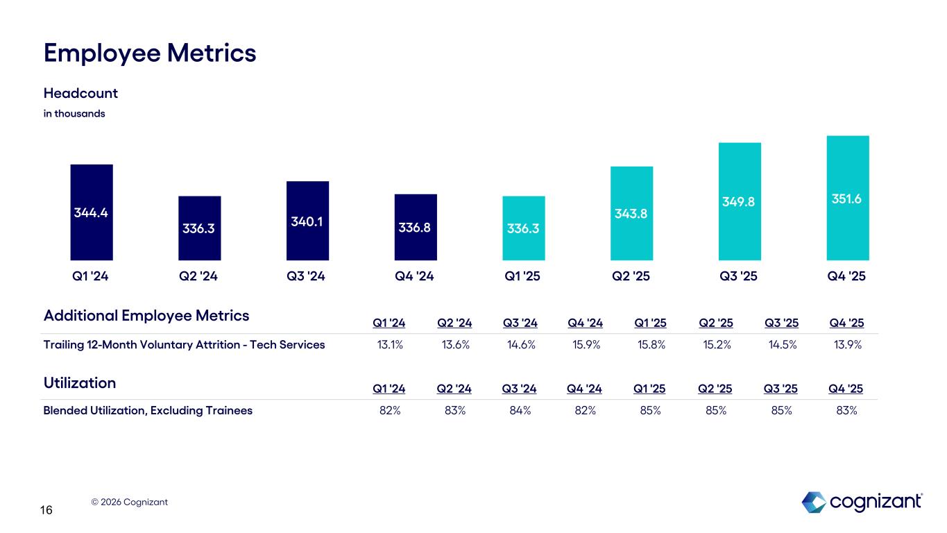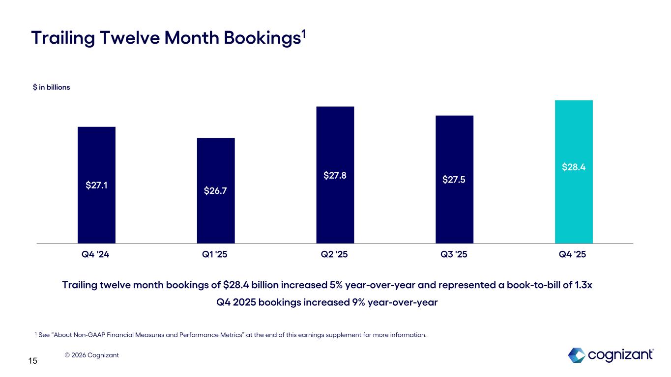 © 2026 Cognizant 15 $27.1 $26.7 $27.8 $27.5 $28.4 Q4 '24 Q1 '25 Q2 '25 Q3 '25 Q4 '25 Trailing Twelve Month Bookings1 Trailing twelve month bookings of $28.4 billion increased 5% year-over-year and represented a book-to-bill of 1.3x Q4 2025 bookings increased 9% year-over-year $ in billions 1 See “About Non-GAAP Financial Measures and Performance Metrics” at the end of this earnings supplement for more information.