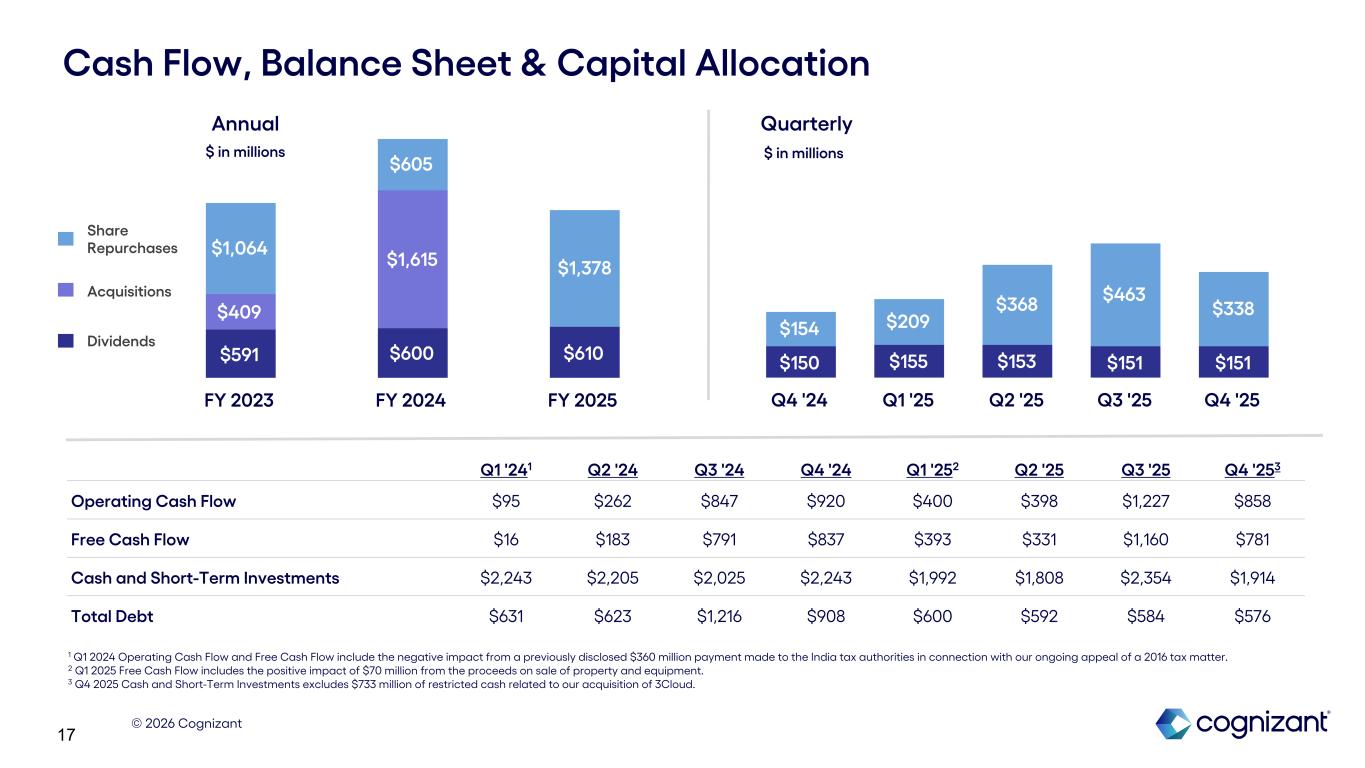 © 2026 Cognizant 17 $591 $600 $610 $409 $1,615$1,064 $605 $1,378 FY 2023 FY 2024 FY 2025 Acquisitions Share Repurchases $150 $155 $153 $151 $151 $154 $209 $368 $463 $338 Q4 '24 Q1 '25 Q2 '25 Q3 '25 Q4 '25 Cash Flow, Balance Sheet & Capital Allocation Q1 '241 Q2 '24 Q3 '24 Q4 '24 Q1 '252 Q2 '25 Q3 '25 Q4 '253 Operating Cash Flow $95 $262 $847 $920 $400 $398 $1,227 $858 Free Cash Flow $16 $183 $791 $837 $393 $331 $1,160 $781 Cash and Short-Term Investments $2,243 $2,205 $2,025 $2,243 $1,992 $1,808 $2,354 $1,914 Total Debt $631 $623 $1,216 $908 $600 $592 $584 $576 Annual Quarterly Dividends $ in millions $ in millions 1 Q1 2024 Operating Cash Flow and Free Cash Flow include the negative impact from a previously disclosed $360 million payment made to the India tax authorities in connection with our ongoing appeal of a 2016 tax matter. 2 Q1 2025 Free Cash Flow includes the positive impact of $70 million from the proceeds on sale of property and equipment. 3 Q4 2025 Cash and Short-Term Investments excludes $733 million of restricted cash related to our acquisition of 3Cloud.