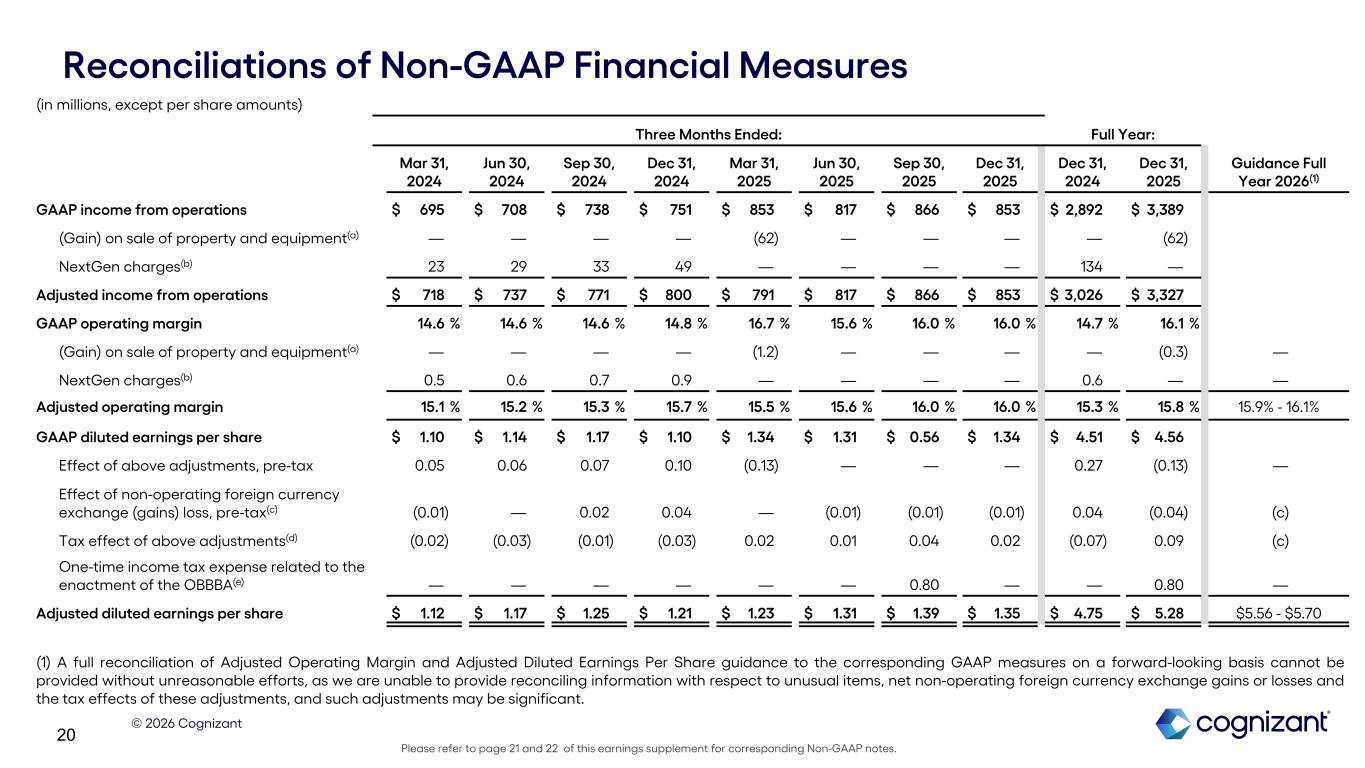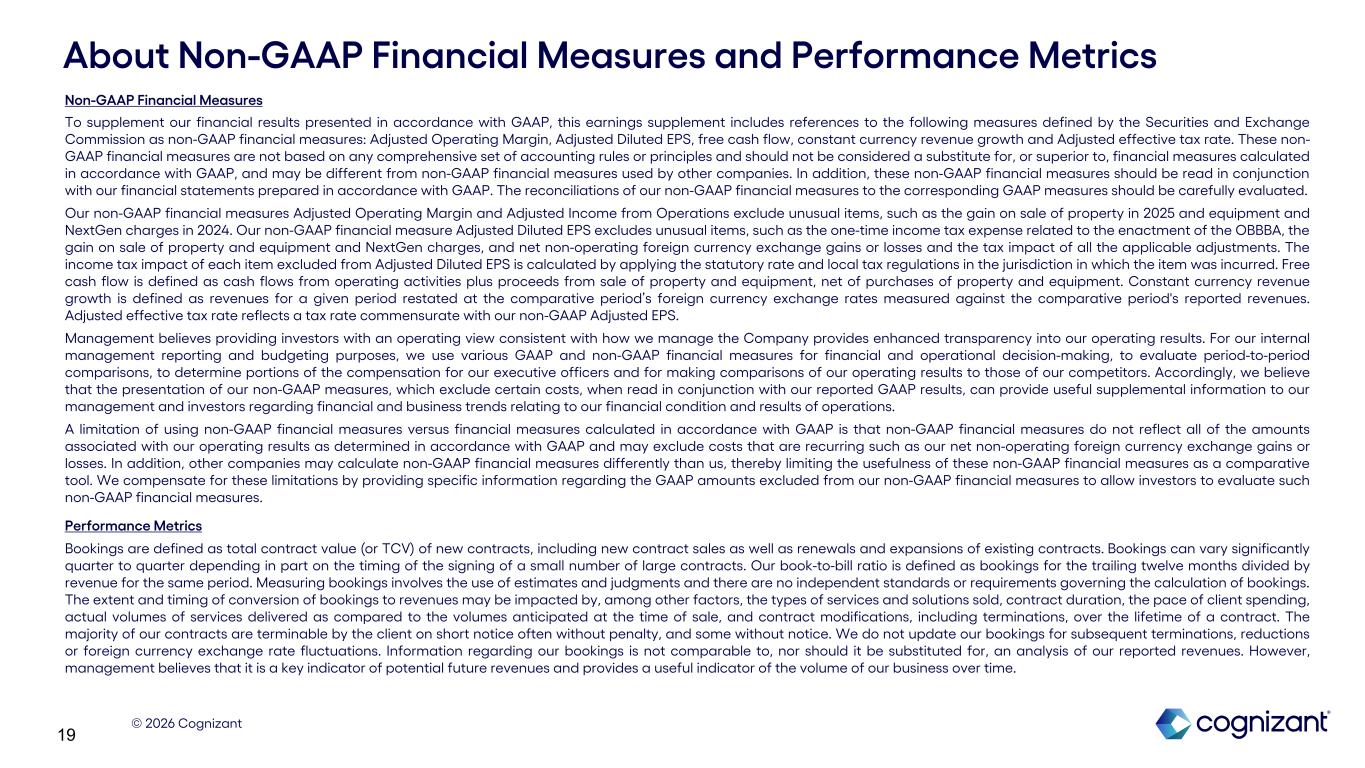 © 2026 Cognizant 19 Non-GAAP Financial Measures To supplement our financial results presented in accordance with GAAP, this earnings supplement includes references to the following measures defined by the Securities and Exchange Commission as non-GAAP financial measures: Adjusted Operating Margin, Adjusted Diluted EPS, free cash flow, constant currency revenue growth and Adjusted effective tax rate. These non- GAAP financial measures are not based on any comprehensive set of accounting rules or principles and should not be considered a substitute for, or superior to, financial measures calculated in accordance with GAAP, and may be different from non-GAAP financial measures used by other companies. In addition, these non-GAAP financial measures should be read in conjunction with our financial statements prepared in accordance with GAAP. The reconciliations of our non-GAAP financial measures to the corresponding GAAP measures should be carefully evaluated. Our non-GAAP financial measures Adjusted Operating Margin and Adjusted Income from Operations exclude unusual items, such as the gain on sale of property in 2025 and equipment and NextGen charges in 2024. Our non-GAAP financial measure Adjusted Diluted EPS excludes unusual items, such as the one-time income tax expense related to the enactment of the OBBBA, the gain on sale of property and equipment and NextGen charges, and net non-operating foreign currency exchange gains or losses and the tax impact of all the applicable adjustments. The income tax impact of each item excluded from Adjusted Diluted EPS is calculated by applying the statutory rate and local tax regulations in the jurisdiction in which the item was incurred. Free cash flow is defined as cash flows from operating activities plus proceeds from sale of property and equipment, net of purchases of property and equipment. Constant currency revenue growth is defined as revenues for a given period restated at the comparative period’s foreign currency exchange rates measured against the comparative period's reported revenues. Adjusted effective tax rate reflects a tax rate commensurate with our non-GAAP Adjusted EPS. Management believes providing investors with an operating view consistent with how we manage the Company provides enhanced transparency into our operating results. For our internal management reporting and budgeting purposes, we use various GAAP and non-GAAP financial measures for financial and operational decision-making, to evaluate period-to-period comparisons, to determine portions of the compensation for our executive officers and for making comparisons of our operating results to those of our competitors. Accordingly, we believe that the presentation of our non-GAAP measures, which exclude certain costs, when read in conjunction with our reported GAAP results, can provide useful supplemental information to our management and investors regarding financial and business trends relating to our financial condition and results of operations. A limitation of using non-GAAP financial measures versus financial measures calculated in accordance with GAAP is that non-GAAP financial measures do not reflect all of the amounts associated with our operating results as determined in accordance with GAAP and may exclude costs that are recurring such as our net non-operating foreign currency exchange gains or losses. In addition, other companies may calculate non-GAAP financial measures differently than us, thereby limiting the usefulness of these non-GAAP financial measures as a comparative tool. We compensate for these limitations by providing specific information regarding the GAAP amounts excluded from our non-GAAP financial measures to allow investors to evaluate such non-GAAP financial measures. Performance Metrics Bookings are defined as total contract value (or TCV) of new contracts, including new contract sales as well as renewals and expansions of existing contracts. Bookings can vary significantly quarter to quarter depending in part on the timing of the signing of a small number of large contracts. Our book-to-bill ratio is defined as bookings for the trailing twelve months divided by revenue for the same period. Measuring bookings involves the use of estimates and judgments and there are no independent standards or requirements governing the calculation of bookings. The extent and timing of conversion of bookings to revenues may be impacted by, among other factors, the types of services and solutions sold, contract duration, the pace of client spending, actual volumes of services delivered as compared to the volumes anticipated at the time of sale, and contract modifications, including terminations, over the lifetime of a contract. The majority of our contracts are terminable by the client on short notice often without penalty, and some without notice. We do not update our bookings for subsequent terminations, reductions or foreign currency exchange rate fluctuations. Information regarding our bookings is not comparable to, nor should it be substituted for, an analysis of our reported revenues. However, management believes that it is a key indicator of potential future revenues and provides a useful indicator of the volume of our business over time. About Non-GAAP Financial Measures and Performance Metrics