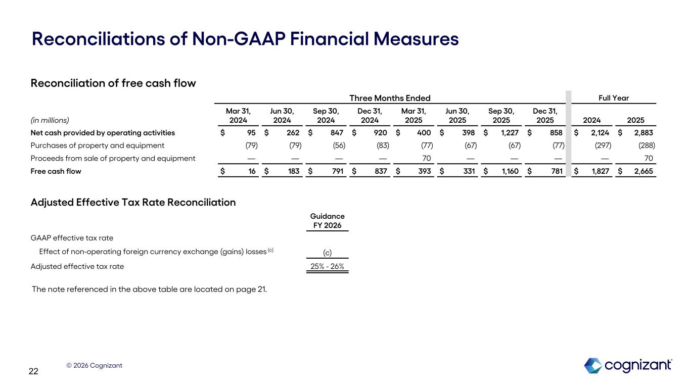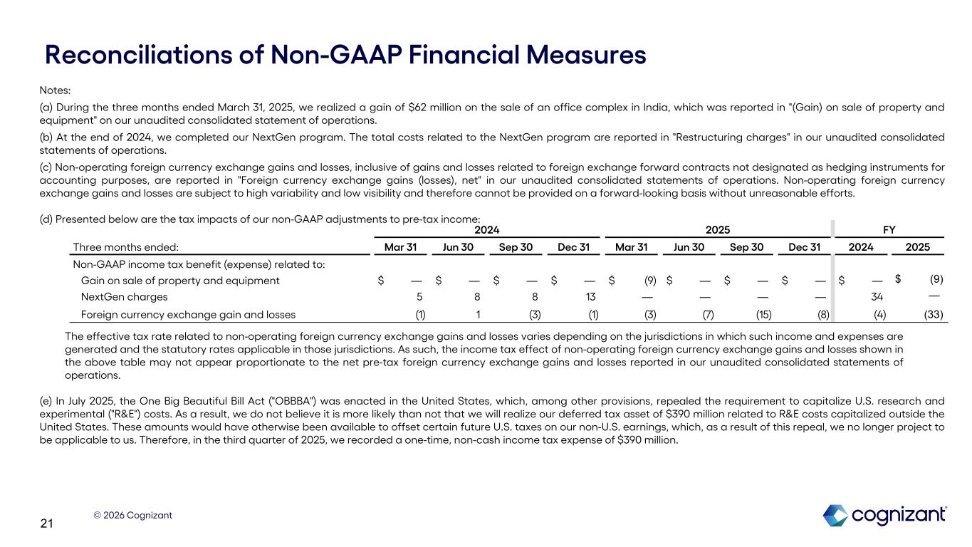 © 2026 Cognizant 21 Reconciliations of Non-GAAP Financial Measures Notes: (a) During the three months ended March 31, 2025, we realized a gain of $62 million on the sale of an office complex in India, which was reported in "(Gain) on sale of property and equipment" on our unaudited consolidated statement of operations. (b) At the end of 2024, we completed our NextGen program. The total costs related to the NextGen program are reported in "Restructuring charges" in our unaudited consolidated statements of operations. (c) Non-operating foreign currency exchange gains and losses, inclusive of gains and losses related to foreign exchange forward contracts not designated as hedging instruments for accounting purposes, are reported in "Foreign currency exchange gains (losses), net" in our unaudited consolidated statements of operations. Non-operating foreign currency exchange gains and losses are subject to high variability and low visibility and therefore cannot be provided on a forward-looking basis without unreasonable efforts. 2024 2025 FY Three months ended: Mar 31 Jun 30 Sep 30 Dec 31 Mar 31 Jun 30 Sep 30 Dec 31 2024 2025 Non-GAAP income tax benefit (expense) related to: Gain on sale of property and equipment $ — $ — $ — $ — $ (9) $ — $ — $ — $ — $ (9) NextGen charges 5 8 8 13 — — — — 34 — Foreign currency exchange gain and losses (1) 1 (3) (1) (3) (7) (15) (8) (4) (33) (d) Presented below are the tax impacts of our non-GAAP adjustments to pre-tax income: The effective tax rate related to non-operating foreign currency exchange gains and losses varies depending on the jurisdictions in which such income and expenses are generated and the statutory rates applicable in those jurisdictions. As such, the income tax effect of non-operating foreign currency exchange gains and losses shown in the above table may not appear proportionate to the net pre-tax foreign currency exchange gains and losses reported in our unaudited consolidated statements of operations. (e) In July 2025, the One Big Beautiful Bill Act ("OBBBA") was enacted in the United States, which, among other provisions, repealed the requirement to capitalize U.S. research and experimental ("R&E") costs. As a result, we do not believe it is more likely than not that we will realize our deferred tax asset of $390 million related to R&E costs capitalized outside the United States. These amounts would have otherwise been available to offset certain future U.S. taxes on our non-U.S. earnings, which, as a result of this repeal, we no longer project to be applicable to us. Therefore, in the third quarter of 2025, we recorded a one-time, non-cash income tax expense of $390 million.