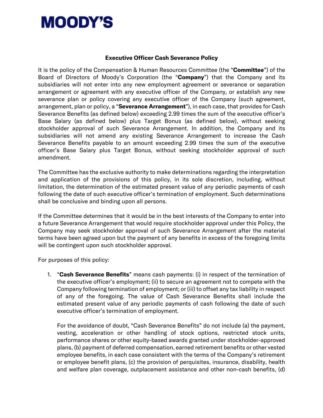 Executive Officer Cash Severance Policy It is the policy of the Compensation & Human Resources Committee (the “Committee”) of the Board of Directors of Moody’s Corporation (the “Company”) that the Company and its subsidiaries will not enter into any new employment agreement or severance or separation arrangement or agreement with any executive officer of the Company, or establish any new severance plan or policy covering any executive officer of the Company (such agreement, arrangement, plan or policy, a “Severance Arrangement”), in each case, that provides for Cash Severance Benefits (as defined below) exceeding 2.99 times the sum of the executive officer’s Base Salary (as defined below) plus Target Bonus (as defined below), without seeking stockholder approval of such Severance Arrangement. In addition, the Company and its subsidiaries will not amend any existing Severance Arrangement to increase the Cash Severance Benefits payable to an amount exceeding 2.99 times the sum of the executive officer’s Base Salary plus Target Bonus, without seeking stockholder approval of such amendment. The Committee has the exclusive authority to make determinations regarding the interpretation and application of the provisions of this policy, in its sole discretion, including, without limitation, the determination of the estimated present value of any periodic payments of cash following the date of such executive officer’s termination of employment. Such determinations shall be conclusive and binding upon all persons. If the Committee determines that it would be in the best interests of the Company to enter into a future Severance Arrangement that would require stockholder approval under this Policy, the Company may seek stockholder approval of such Severance Arrangement after the material terms have been agreed upon but the payment of any benefits in excess of the foregoing limits will be contingent upon such stockholder approval. For purposes of this policy: 1. “Cash Severance Benefits” means cash payments: (i) in respect of the termination of the executive officer’s employment; (ii) to secure an agreement not to compete with the Company following termination of employment; or (iii) to offset any tax liability in respect of any of the foregoing. The value of Cash Severance Benefits shall include the estimated present value of any periodic payments of cash following the date of such executive officer’s termination of employment. For the avoidance of doubt, “Cash Severance Benefits” do not include (a) the payment, vesting, acceleration or other handling of stock options, restricted stock units, performance shares or other equity-based awards granted under stockholder-approved plans, (b) payment of deferred compensation, earned retirement benefits or other vested employee benefits, in each case consistent with the terms of the Company’s retirement or employee benefit plans, (c) the provision of perquisites, insurance, disability, health and welfare plan coverage, outplacement assistance and other non-cash benefits, (d)
