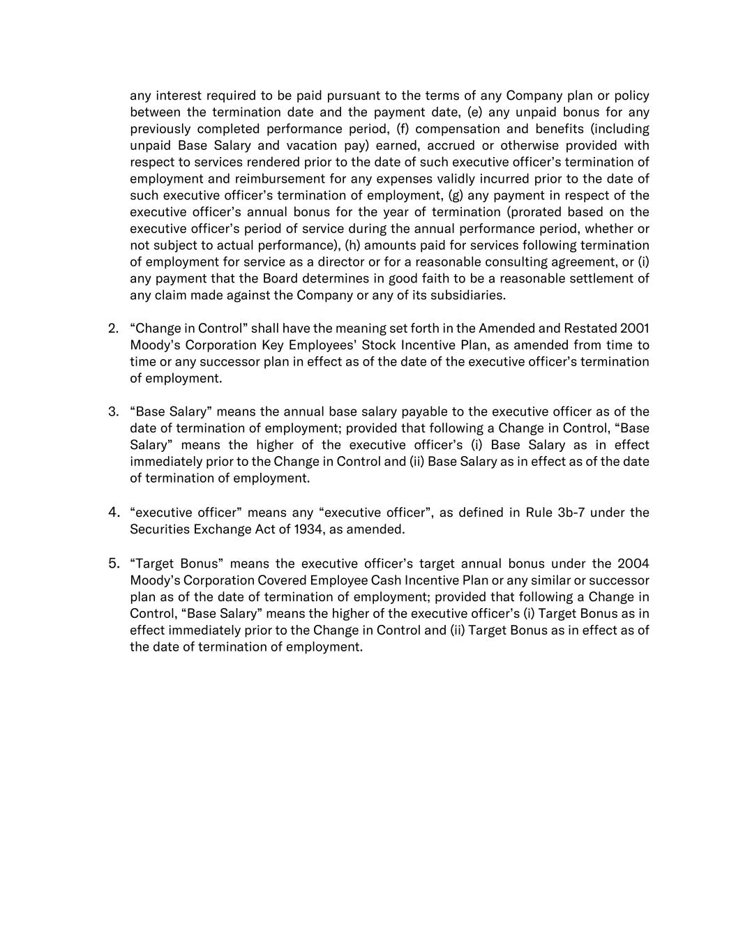 any interest required to be paid pursuant to the terms of any Company plan or policy between the termination date and the payment date, (e) any unpaid bonus for any previously completed performance period, (f) compensation and benefits (including unpaid Base Salary and vacation pay) earned, accrued or otherwise provided with respect to services rendered prior to the date of such executive officer’s termination of employment and reimbursement for any expenses validly incurred prior to the date of such executive officer’s termination of employment, (g) any payment in respect of the executive officer’s annual bonus for the year of termination (prorated based on the executive officer’s period of service during the annual performance period, whether or not subject to actual performance), (h) amounts paid for services following termination of employment for service as a director or for a reasonable consulting agreement, or (i) any payment that the Board determines in good faith to be a reasonable settlement of any claim made against the Company or any of its subsidiaries. 2. “Change in Control” shall have the meaning set forth in the Amended and Restated 2001 Moody’s Corporation Key Employees’ Stock Incentive Plan, as amended from time to time or any successor plan in effect as of the date of the executive officer’s termination of employment. 3. “Base Salary” means the annual base salary payable to the executive officer as of the date of termination of employment; provided that following a Change in Control, “Base Salary” means the higher of the executive officer’s (i) Base Salary as in effect immediately prior to the Change in Control and (ii) Base Salary as in effect as of the date of termination of employment. 4. “executive officer” means any “executive officer”, as defined in Rule 3b-7 under the Securities Exchange Act of 1934, as amended. 5. “Target Bonus” means the executive officer’s target annual bonus under the 2004 Moody’s Corporation Covered Employee Cash Incentive Plan or any similar or successor plan as of the date of termination of employment; provided that following a Change in Control, “Base Salary” means the higher of the executive officer’s (i) Target Bonus as in effect immediately prior to the Change in Control and (ii) Target Bonus as in effect as of the date of termination of employment.