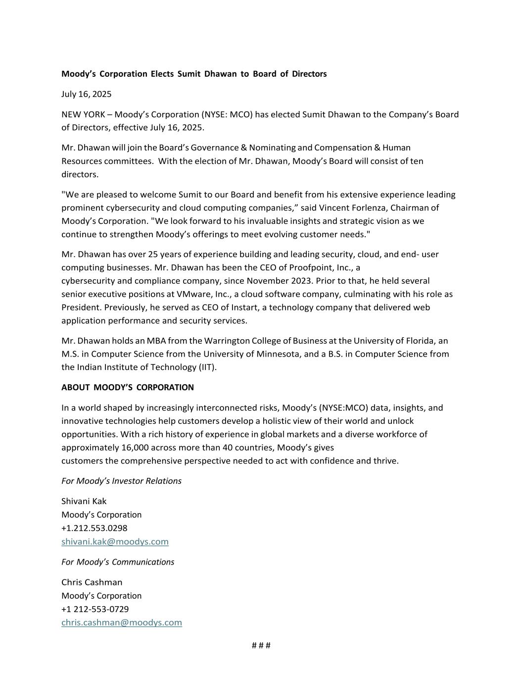 Moody’s Corporation Elects Sumit Dhawan to Board of Directors July 16, 2025 NEW YORK – Moody’s Corporation (NYSE: MCO) has elected Sumit Dhawan to the Company’s Board of Directors, effective July 16, 2025. Mr. Dhawan will join the Board’s Governance & Nominating and Compensation & Human Resources committees. With the election of Mr. Dhawan, Moody’s Board will consist of ten directors. "We are pleased to welcome Sumit to our Board and benefit from his extensive experience leading prominent cybersecurity and cloud computing companies,” said Vincent Forlenza, Chairman of Moody’s Corporation. "We look forward to his invaluable insights and strategic vision as we continue to strengthen Moody’s offerings to meet evolving customer needs." Mr. Dhawan has over 25 years of experience building and leading security, cloud, and end- user computing businesses. Mr. Dhawan has been the CEO of Proofpoint, Inc., a cybersecurity and compliance company, since November 2023. Prior to that, he held several senior executive positions at VMware, Inc., a cloud software company, culminating with his role as President. Previously, he served as CEO of Instart, a technology company that delivered web application performance and security services. Mr. Dhawan holds an MBA from the Warrington College of Business at the University of Florida, an M.S. in Computer Science from the University of Minnesota, and a B.S. in Computer Science from the Indian Institute of Technology (IIT). ABOUT MOODY’S CORPORATION In a world shaped by increasingly interconnected risks, Moody’s (NYSE:MCO) data, insights, and innovative technologies help customers develop a holistic view of their world and unlock opportunities. With a rich history of experience in global markets and a diverse workforce of approximately 16,000 across more than 40 countries, Moody’s gives customers the comprehensive perspective needed to act with confidence and thrive. For Moody’s Investor Relations Shivani Kak Moody’s Corporation +1.212.553.0298 shivani.kak@moodys.com For Moody’s Communications Chris Cashman Moody’s Corporation +1 212-553-0729 chris.cashman@moodys.com # # #