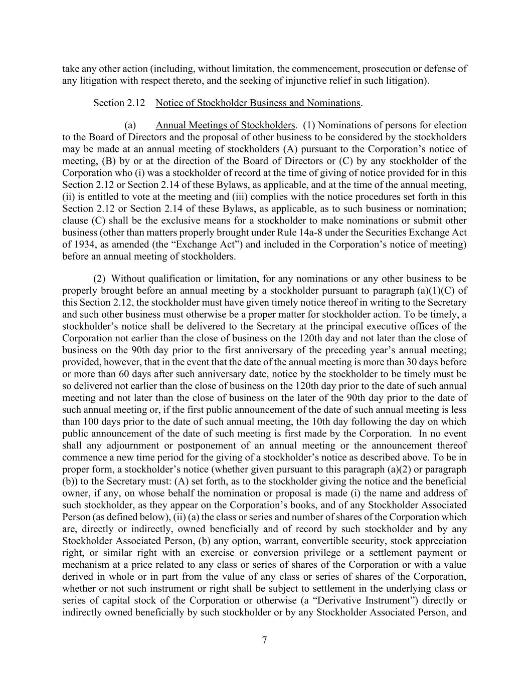 7 take any other action (including, without limitation, the commencement, prosecution or defense of any litigation with respect thereto, and the seeking of injunctive relief in such litigation). Section 2.12 Notice of Stockholder Business and Nominations. (a) Annual Meetings of Stockholders. (1) Nominations of persons for election to the Board of Directors and the proposal of other business to be considered by the stockholders may be made at an annual meeting of stockholders (A) pursuant to the Corporation’s notice of meeting, (B) by or at the direction of the Board of Directors or (C) by any stockholder of the Corporation who (i) was a stockholder of record at the time of giving of notice provided for in this Section 2.12 or Section 2.14 of these Bylaws, as applicable, and at the time of the annual meeting, (ii) is entitled to vote at the meeting and (iii) complies with the notice procedures set forth in this Section 2.12 or Section 2.14 of these Bylaws, as applicable, as to such business or nomination; clause (C) shall be the exclusive means for a stockholder to make nominations or submit other business (other than matters properly brought under Rule 14a-8 under the Securities Exchange Act of 1934, as amended (the “Exchange Act”) and included in the Corporation’s notice of meeting) before an annual meeting of stockholders. (2) Without qualification or limitation, for any nominations or any other business to be properly brought before an annual meeting by a stockholder pursuant to paragraph (a)(1)(C) of this Section 2.12, the stockholder must have given timely notice thereof in writing to the Secretary and such other business must otherwise be a proper matter for stockholder action. To be timely, a stockholder’s notice shall be delivered to the Secretary at the principal executive offices of the Corporation not earlier than the close of business on the 120th day and not later than the close of business on the 90th day prior to the first anniversary of the preceding year’s annual meeting; provided, however, that in the event that the date of the annual meeting is more than 30 days before or more than 60 days after such anniversary date, notice by the stockholder to be timely must be so delivered not earlier than the close of business on the 120th day prior to the date of such annual meeting and not later than the close of business on the later of the 90th day prior to the date of such annual meeting or, if the first public announcement of the date of such annual meeting is less than 100 days prior to the date of such annual meeting, the 10th day following the day on which public announcement of the date of such meeting is first made by the Corporation. In no event shall any adjournment or postponement of an annual meeting or the announcement thereof commence a new time period for the giving of a stockholder’s notice as described above. To be in proper form, a stockholder’s notice (whether given pursuant to this paragraph (a)(2) or paragraph (b)) to the Secretary must: (A) set forth, as to the stockholder giving the notice and the beneficial owner, if any, on whose behalf the nomination or proposal is made (i) the name and address of such stockholder, as they appear on the Corporation’s books, and of any Stockholder Associated Person (as defined below), (ii) (a) the class or series and number of shares of the Corporation which are, directly or indirectly, owned beneficially and of record by such stockholder and by any Stockholder Associated Person, (b) any option, warrant, convertible security, stock appreciation right, or similar right with an exercise or conversion privilege or a settlement payment or mechanism at a price related to any class or series of shares of the Corporation or with a value derived in whole or in part from the value of any class or series of shares of the Corporation, whether or not such instrument or right shall be subject to settlement in the underlying class or series of capital stock of the Corporation or otherwise (a “Derivative Instrument”) directly or indirectly owned beneficially by such stockholder or by any Stockholder Associated Person, and