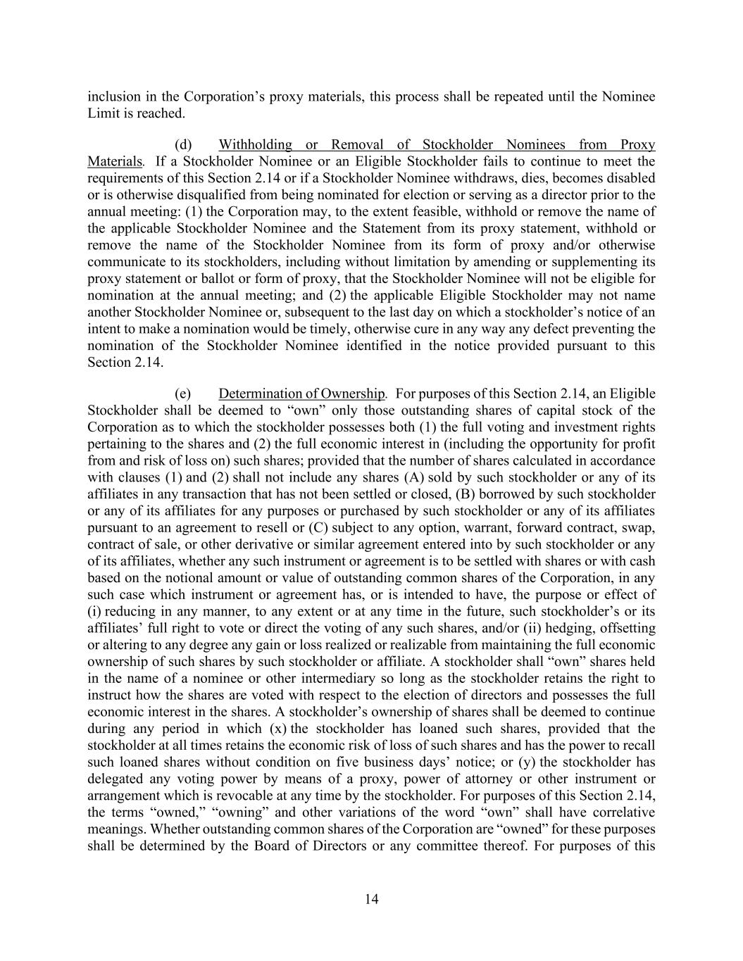 14 inclusion in the Corporation’s proxy materials, this process shall be repeated until the Nominee Limit is reached. (d) Withholding or Removal of Stockholder Nominees from Proxy Materials. If a Stockholder Nominee or an Eligible Stockholder fails to continue to meet the requirements of this Section 2.14 or if a Stockholder Nominee withdraws, dies, becomes disabled or is otherwise disqualified from being nominated for election or serving as a director prior to the annual meeting: (1) the Corporation may, to the extent feasible, withhold or remove the name of the applicable Stockholder Nominee and the Statement from its proxy statement, withhold or remove the name of the Stockholder Nominee from its form of proxy and/or otherwise communicate to its stockholders, including without limitation by amending or supplementing its proxy statement or ballot or form of proxy, that the Stockholder Nominee will not be eligible for nomination at the annual meeting; and (2) the applicable Eligible Stockholder may not name another Stockholder Nominee or, subsequent to the last day on which a stockholder’s notice of an intent to make a nomination would be timely, otherwise cure in any way any defect preventing the nomination of the Stockholder Nominee identified in the notice provided pursuant to this Section 2.14. (e) Determination of Ownership. For purposes of this Section 2.14, an Eligible Stockholder shall be deemed to “own” only those outstanding shares of capital stock of the Corporation as to which the stockholder possesses both (1) the full voting and investment rights pertaining to the shares and (2) the full economic interest in (including the opportunity for profit from and risk of loss on) such shares; provided that the number of shares calculated in accordance with clauses (1) and (2) shall not include any shares (A) sold by such stockholder or any of its affiliates in any transaction that has not been settled or closed, (B) borrowed by such stockholder or any of its affiliates for any purposes or purchased by such stockholder or any of its affiliates pursuant to an agreement to resell or (C) subject to any option, warrant, forward contract, swap, contract of sale, or other derivative or similar agreement entered into by such stockholder or any of its affiliates, whether any such instrument or agreement is to be settled with shares or with cash based on the notional amount or value of outstanding common shares of the Corporation, in any such case which instrument or agreement has, or is intended to have, the purpose or effect of (i) reducing in any manner, to any extent or at any time in the future, such stockholder’s or its affiliates’ full right to vote or direct the voting of any such shares, and/or (ii) hedging, offsetting or altering to any degree any gain or loss realized or realizable from maintaining the full economic ownership of such shares by such stockholder or affiliate. A stockholder shall “own” shares held in the name of a nominee or other intermediary so long as the stockholder retains the right to instruct how the shares are voted with respect to the election of directors and possesses the full economic interest in the shares. A stockholder’s ownership of shares shall be deemed to continue during any period in which (x) the stockholder has loaned such shares, provided that the stockholder at all times retains the economic risk of loss of such shares and has the power to recall such loaned shares without condition on five business days’ notice; or (y) the stockholder has delegated any voting power by means of a proxy, power of attorney or other instrument or arrangement which is revocable at any time by the stockholder. For purposes of this Section 2.14, the terms “owned,” “owning” and other variations of the word “own” shall have correlative meanings. Whether outstanding common shares of the Corporation are “owned” for these purposes shall be determined by the Board of Directors or any committee thereof. For purposes of this