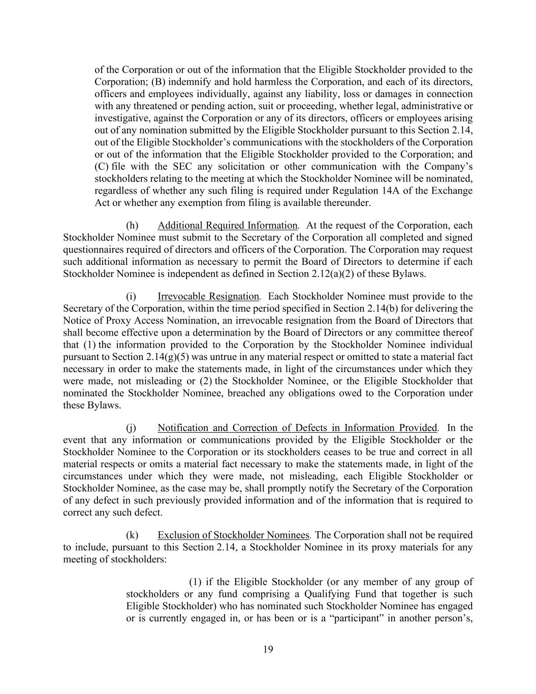 19 of the Corporation or out of the information that the Eligible Stockholder provided to the Corporation; (B) indemnify and hold harmless the Corporation, and each of its directors, officers and employees individually, against any liability, loss or damages in connection with any threatened or pending action, suit or proceeding, whether legal, administrative or investigative, against the Corporation or any of its directors, officers or employees arising out of any nomination submitted by the Eligible Stockholder pursuant to this Section 2.14, out of the Eligible Stockholder’s communications with the stockholders of the Corporation or out of the information that the Eligible Stockholder provided to the Corporation; and (C) file with the SEC any solicitation or other communication with the Company’s stockholders relating to the meeting at which the Stockholder Nominee will be nominated, regardless of whether any such filing is required under Regulation 14A of the Exchange Act or whether any exemption from filing is available thereunder. (h) Additional Required Information. At the request of the Corporation, each Stockholder Nominee must submit to the Secretary of the Corporation all completed and signed questionnaires required of directors and officers of the Corporation. The Corporation may request such additional information as necessary to permit the Board of Directors to determine if each Stockholder Nominee is independent as defined in Section 2.12(a)(2) of these Bylaws. (i) Irrevocable Resignation. Each Stockholder Nominee must provide to the Secretary of the Corporation, within the time period specified in Section 2.14(b) for delivering the Notice of Proxy Access Nomination, an irrevocable resignation from the Board of Directors that shall become effective upon a determination by the Board of Directors or any committee thereof that (1) the information provided to the Corporation by the Stockholder Nominee individual pursuant to Section 2.14(g)(5) was untrue in any material respect or omitted to state a material fact necessary in order to make the statements made, in light of the circumstances under which they were made, not misleading or (2) the Stockholder Nominee, or the Eligible Stockholder that nominated the Stockholder Nominee, breached any obligations owed to the Corporation under these Bylaws. (j) Notification and Correction of Defects in Information Provided. In the event that any information or communications provided by the Eligible Stockholder or the Stockholder Nominee to the Corporation or its stockholders ceases to be true and correct in all material respects or omits a material fact necessary to make the statements made, in light of the circumstances under which they were made, not misleading, each Eligible Stockholder or Stockholder Nominee, as the case may be, shall promptly notify the Secretary of the Corporation of any defect in such previously provided information and of the information that is required to correct any such defect. (k) Exclusion of Stockholder Nominees. The Corporation shall not be required to include, pursuant to this Section 2.14, a Stockholder Nominee in its proxy materials for any meeting of stockholders: (1) if the Eligible Stockholder (or any member of any group of stockholders or any fund comprising a Qualifying Fund that together is such Eligible Stockholder) who has nominated such Stockholder Nominee has engaged or is currently engaged in, or has been or is a “participant” in another person’s,