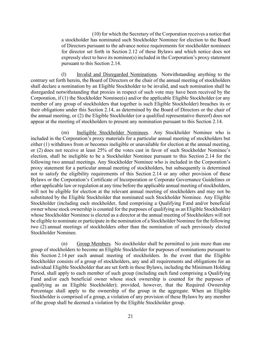 21 (10) for which the Secretary of the Corporation receives a notice that a stockholder has nominated such Stockholder Nominee for election to the Board of Directors pursuant to the advance notice requirements for stockholder nominees for director set forth in Section 2.12 of these Bylaws and which notice does not expressly elect to have its nominee(s) included in the Corporation’s proxy statement pursuant to this Section 2.14. (l) Invalid and Disregarded Nominations. Notwithstanding anything to the contrary set forth herein, the Board of Directors or the chair of the annual meeting of stockholders shall declare a nomination by an Eligible Stockholder to be invalid, and such nomination shall be disregarded notwithstanding that proxies in respect of such vote may have been received by the Corporation, if (1) the Stockholder Nominee(s) and/or the applicable Eligible Stockholder (or any member of any group of stockholders that together is such Eligible Stockholder) breaches its or their obligations under this Section 2.14, as determined by the Board of Directors or the chair of the annual meeting, or (2) the Eligible Stockholder (or a qualified representative thereof) does not appear at the meeting of stockholders to present any nomination pursuant to this Section 2.14. (m) Ineligible Stockholder Nominees. Any Stockholder Nominee who is included in the Corporation’s proxy materials for a particular annual meeting of stockholders but either (1) withdraws from or becomes ineligible or unavailable for election at the annual meeting, or (2) does not receive at least 25% of the votes cast in favor of such Stockholder Nominee’s election, shall be ineligible to be a Stockholder Nominee pursuant to this Section 2.14 for the following two annual meetings. Any Stockholder Nominee who is included in the Corporation’s proxy statement for a particular annual meeting of stockholders, but subsequently is determined not to satisfy the eligibility requirements of this Section 2.14 or any other provision of these Bylaws or the Corporation’s Certificate of Incorporation or Corporate Governance Guidelines or other applicable law or regulation at any time before the applicable annual meeting of stockholders, will not be eligible for election at the relevant annual meeting of stockholders and may not be substituted by the Eligible Stockholder that nominated such Stockholder Nominee. Any Eligible Stockholder (including each stockholder, fund comprising a Qualifying Fund and/or beneficial owner whose stock ownership is counted for the purposes of qualifying as an Eligible Stockholder) whose Stockholder Nominee is elected as a director at the annual meeting of Stockholders will not be eligible to nominate or participate in the nomination of a Stockholder Nominee for the following two (2) annual meetings of stockholders other than the nomination of such previously elected Stockholder Nominee. (n) Group Members. No stockholder shall be permitted to join more than one group of stockholders to become an Eligible Stockholder for purposes of nominations pursuant to this Section 2.14 per each annual meeting of stockholders. In the event that the Eligible Stockholder consists of a group of stockholders, any and all requirements and obligations for an individual Eligible Stockholder that are set forth in these Bylaws, including the Minimum Holding Period, shall apply to each member of such group (including each fund comprising a Qualifying Fund and/or each beneficial owner whose stock ownership is counted for the purposes of qualifying as an Eligible Stockholder); provided, however, that the Required Ownership Percentage shall apply to the ownership of the group in the aggregate. When an Eligible Stockholder is comprised of a group, a violation of any provision of these Bylaws by any member of the group shall be deemed a violation by the Eligible Stockholder group.