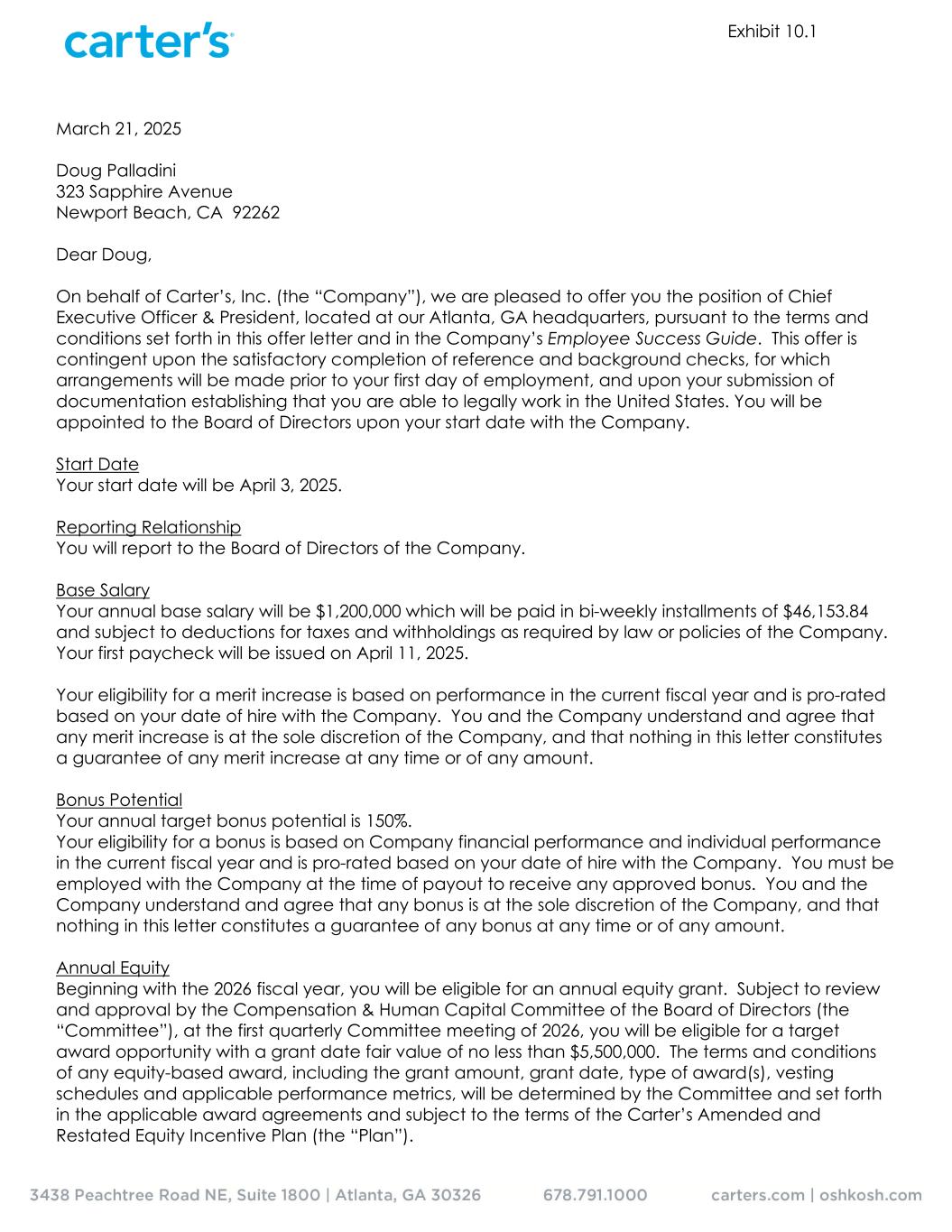 March 21, 2025 Doug Palladini 323 Sapphire Avenue Newport Beach, CA 92262 Dear Doug, On behalf of Carter’s, Inc. (the “Company”), we are pleased to offer you the position of Chief Executive Officer & President, located at our Atlanta, GA headquarters, pursuant to the terms and conditions set forth in this offer letter and in the Company’s Employee Success Guide. This offer is contingent upon the satisfactory completion of reference and background checks, for which arrangements will be made prior to your first day of employment, and upon your submission of documentation establishing that you are able to legally work in the United States. You will be appointed to the Board of Directors upon your start date with the Company. Start Date Your start date will be April 3, 2025. Reporting Relationship You will report to the Board of Directors of the Company. Base Salary Your annual base salary will be $1,200,000 which will be paid in bi-weekly installments of $46,153.84 and subject to deductions for taxes and withholdings as required by law or policies of the Company. Your first paycheck will be issued on April 11, 2025. Your eligibility for a merit increase is based on performance in the current fiscal year and is pro-rated based on your date of hire with the Company. You and the Company understand and agree that any merit increase is at the sole discretion of the Company, and that nothing in this letter constitutes a guarantee of any merit increase at any time or of any amount. Bonus Potential Your annual target bonus potential is 150%. Your eligibility for a bonus is based on Company financial performance and individual performance in the current fiscal year and is pro-rated based on your date of hire with the Company. You must be employed with the Company at the time of payout to receive any approved bonus. You and the Company understand and agree that any bonus is at the sole discretion of the Company, and that nothing in this letter constitutes a guarantee of any bonus at any time or of any amount. Annual Equity Beginning with the 2026 fiscal year, you will be eligible for an annual equity grant. Subject to review and approval by the Compensation & Human Capital Committee of the Board of Directors (the “Committee”), at the first quarterly Committee meeting of 2026, you will be eligible for a target award opportunity with a grant date fair value of no less than $5,500,000. The terms and conditions of any equity-based award, including the grant amount, grant date, type of award(s), vesting schedules and applicable performance metrics, will be determined by the Committee and set forth in the applicable award agreements and subject to the terms of the Carter’s Amended and Restated Equity Incentive Plan (the “Plan”). Exhibit 10.1