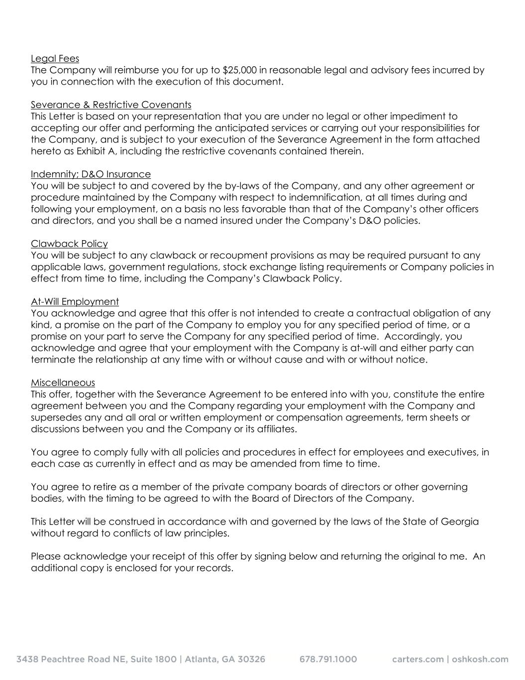 Legal Fees The Company will reimburse you for up to $25,000 in reasonable legal and advisory fees incurred by you in connection with the execution of this document. Severance & Restrictive Covenants This Letter is based on your representation that you are under no legal or other impediment to accepting our offer and performing the anticipated services or carrying out your responsibilities for the Company, and is subject to your execution of the Severance Agreement in the form attached hereto as Exhibit A, including the restrictive covenants contained therein. Indemnity; D&O Insurance You will be subject to and covered by the by-laws of the Company, and any other agreement or procedure maintained by the Company with respect to indemnification, at all times during and following your employment, on a basis no less favorable than that of the Company’s other officers and directors, and you shall be a named insured under the Company’s D&O policies. Clawback Policy You will be subject to any clawback or recoupment provisions as may be required pursuant to any applicable laws, government regulations, stock exchange listing requirements or Company policies in effect from time to time, including the Company’s Clawback Policy. At-Will Employment You acknowledge and agree that this offer is not intended to create a contractual obligation of any kind, a promise on the part of the Company to employ you for any specified period of time, or a promise on your part to serve the Company for any specified period of time. Accordingly, you acknowledge and agree that your employment with the Company is at-will and either party can terminate the relationship at any time with or without cause and with or without notice. Miscellaneous This offer, together with the Severance Agreement to be entered into with you, constitute the entire agreement between you and the Company regarding your employment with the Company and supersedes any and all oral or written employment or compensation agreements, term sheets or discussions between you and the Company or its affiliates. You agree to comply fully with all policies and procedures in effect for employees and executives, in each case as currently in effect and as may be amended from time to time. You agree to retire as a member of the private company boards of directors or other governing bodies, with the timing to be agreed to with the Board of Directors of the Company. This Letter will be construed in accordance with and governed by the laws of the State of Georgia without regard to conflicts of law principles. Please acknowledge your receipt of this offer by signing below and returning the original to me. An additional copy is enclosed for your records.