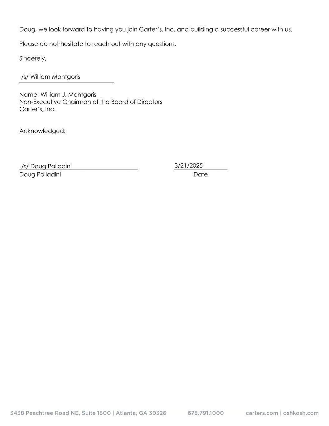 Doug, we look forward to having you join Carter’s, Inc. and building a successful career with us. Please do not hesitate to reach out with any questions. Sincerely, ________________________________ Name: William J. Montgoris Non-Executive Chairman of the Board of Directors Carter’s, Inc. Acknowledged: ________________________________________ __________________ Doug Palladini Date /s/ Doug Palladini /s/ William Montgoris 3/21/2025