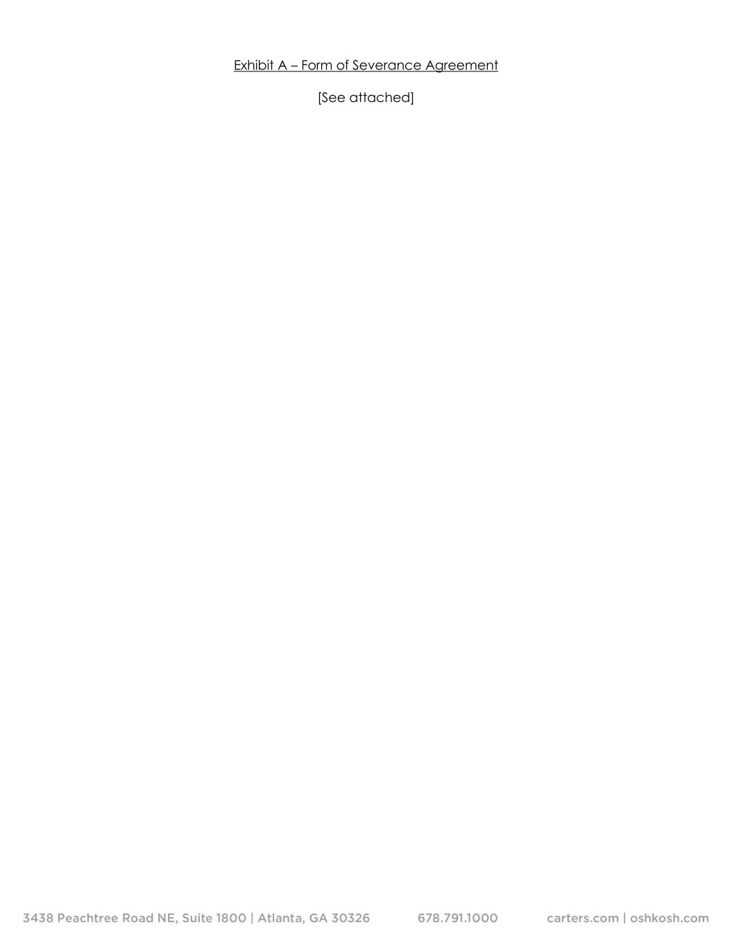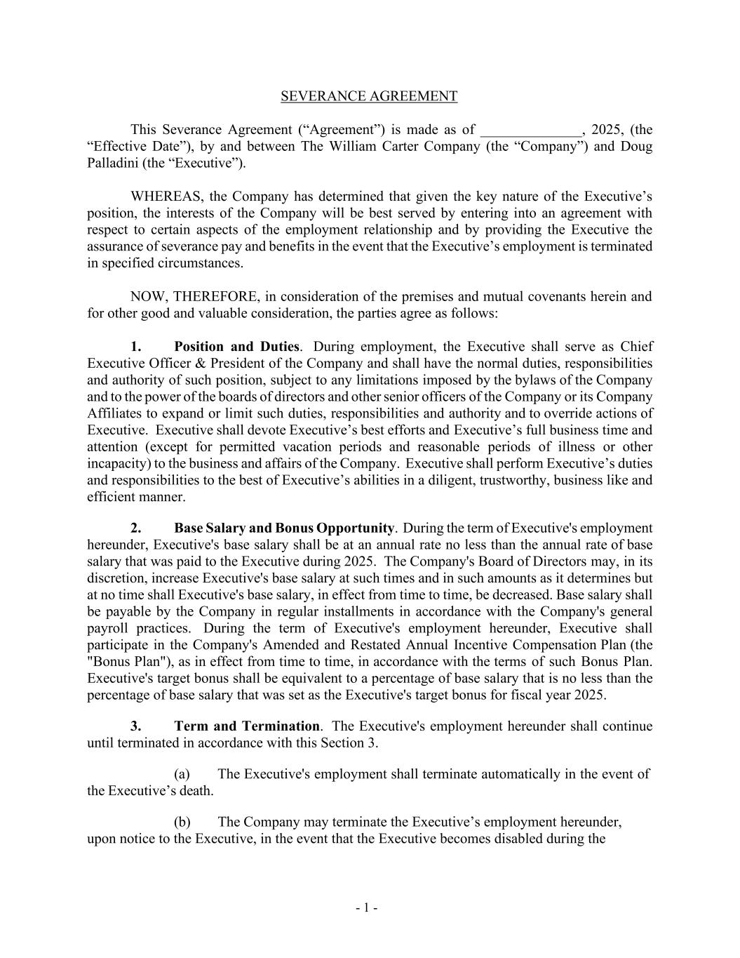 - 1 - SEVERANCE AGREEMENT This Severance Agreement (“Agreement”) is made as of ______________, 2025, (the “Effective Date”), by and between The William Carter Company (the “Company”) and Doug Palladini (the “Executive”). WHEREAS, the Company has determined that given the key nature of the Executive’s position, the interests of the Company will be best served by entering into an agreement with respect to certain aspects of the employment relationship and by providing the Executive the assurance of severance pay and benefits in the event that the Executive’s employment is terminated in specified circumstances. NOW, THEREFORE, in consideration of the premises and mutual covenants herein and for other good and valuable consideration, the parties agree as follows: 1. Position and Duties. During employment, the Executive shall serve as Chief Executive Officer & President of the Company and shall have the normal duties, responsibilities and authority of such position, subject to any limitations imposed by the bylaws of the Company and to the power of the boards of directors and other senior officers of the Company or its Company Affiliates to expand or limit such duties, responsibilities and authority and to override actions of Executive. Executive shall devote Executive’s best efforts and Executive’s full business time and attention (except for permitted vacation periods and reasonable periods of illness or other incapacity) to the business and affairs of the Company. Executive shall perform Executive’s duties and responsibilities to the best of Executive’s abilities in a diligent, trustworthy, business like and efficient manner. 2. Base Salary and Bonus Opportunity. During the term of Executive's employment hereunder, Executive's base salary shall be at an annual rate no less than the annual rate of base salary that was paid to the Executive during 2025. The Company's Board of Directors may, in its discretion, increase Executive's base salary at such times and in such amounts as it determines but at no time shall Executive's base salary, in effect from time to time, be decreased. Base salary shall be payable by the Company in regular installments in accordance with the Company's general payroll practices. During the term of Executive's employment hereunder, Executive shall participate in the Company's Amended and Restated Annual Incentive Compensation Plan (the "Bonus Plan"), as in effect from time to time, in accordance with the terms of such Bonus Plan. Executive's target bonus shall be equivalent to a percentage of base salary that is no less than the percentage of base salary that was set as the Executive's target bonus for fiscal year 2025. 3. Term and Termination. The Executive's employment hereunder shall continue until terminated in accordance with this Section 3. (a) The Executive's employment shall terminate automatically in the event of the Executive’s death. (b) The Company may terminate the Executive’s employment hereunder, upon notice to the Executive, in the event that the Executive becomes disabled during the