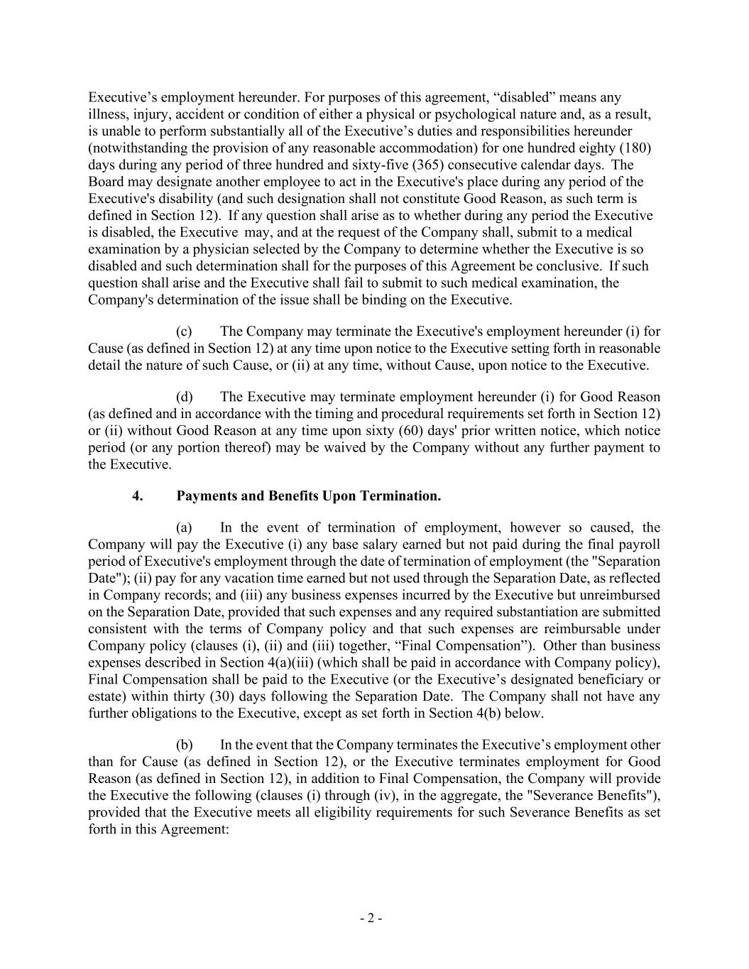 - 2 - Executive’s employment hereunder. For purposes of this agreement, “disabled” means any illness, injury, accident or condition of either a physical or psychological nature and, as a result, is unable to perform substantially all of the Executive’s duties and responsibilities hereunder (notwithstanding the provision of any reasonable accommodation) for one hundred eighty (180) days during any period of three hundred and sixty-five (365) consecutive calendar days. The Board may designate another employee to act in the Executive's place during any period of the Executive's disability (and such designation shall not constitute Good Reason, as such term is defined in Section 12). If any question shall arise as to whether during any period the Executive is disabled, the Executive may, and at the request of the Company shall, submit to a medical examination by a physician selected by the Company to determine whether the Executive is so disabled and such determination shall for the purposes of this Agreement be conclusive. If such question shall arise and the Executive shall fail to submit to such medical examination, the Company's determination of the issue shall be binding on the Executive. (c) The Company may terminate the Executive's employment hereunder (i) for Cause (as defined in Section 12) at any time upon notice to the Executive setting forth in reasonable detail the nature of such Cause, or (ii) at any time, without Cause, upon notice to the Executive. (d) The Executive may terminate employment hereunder (i) for Good Reason (as defined and in accordance with the timing and procedural requirements set forth in Section 12) or (ii) without Good Reason at any time upon sixty (60) days' prior written notice, which notice period (or any portion thereof) may be waived by the Company without any further payment to the Executive. 4. Payments and Benefits Upon Termination. (a) In the event of termination of employment, however so caused, the Company will pay the Executive (i) any base salary earned but not paid during the final payroll period of Executive's employment through the date of termination of employment (the "Separation Date"); (ii) pay for any vacation time earned but not used through the Separation Date, as reflected in Company records; and (iii) any business expenses incurred by the Executive but unreimbursed on the Separation Date, provided that such expenses and any required substantiation are submitted consistent with the terms of Company policy and that such expenses are reimbursable under Company policy (clauses (i), (ii) and (iii) together, “Final Compensation”). Other than business expenses described in Section 4(a)(iii) (which shall be paid in accordance with Company policy), Final Compensation shall be paid to the Executive (or the Executive’s designated beneficiary or estate) within thirty (30) days following the Separation Date. The Company shall not have any further obligations to the Executive, except as set forth in Section 4(b) below. (b) In the event that the Company terminates the Executive’s employment other than for Cause (as defined in Section 12), or the Executive terminates employment for Good Reason (as defined in Section 12), in addition to Final Compensation, the Company will provide the Executive the following (clauses (i) through (iv), in the aggregate, the "Severance Benefits"), provided that the Executive meets all eligibility requirements for such Severance Benefits as set forth in this Agreement: