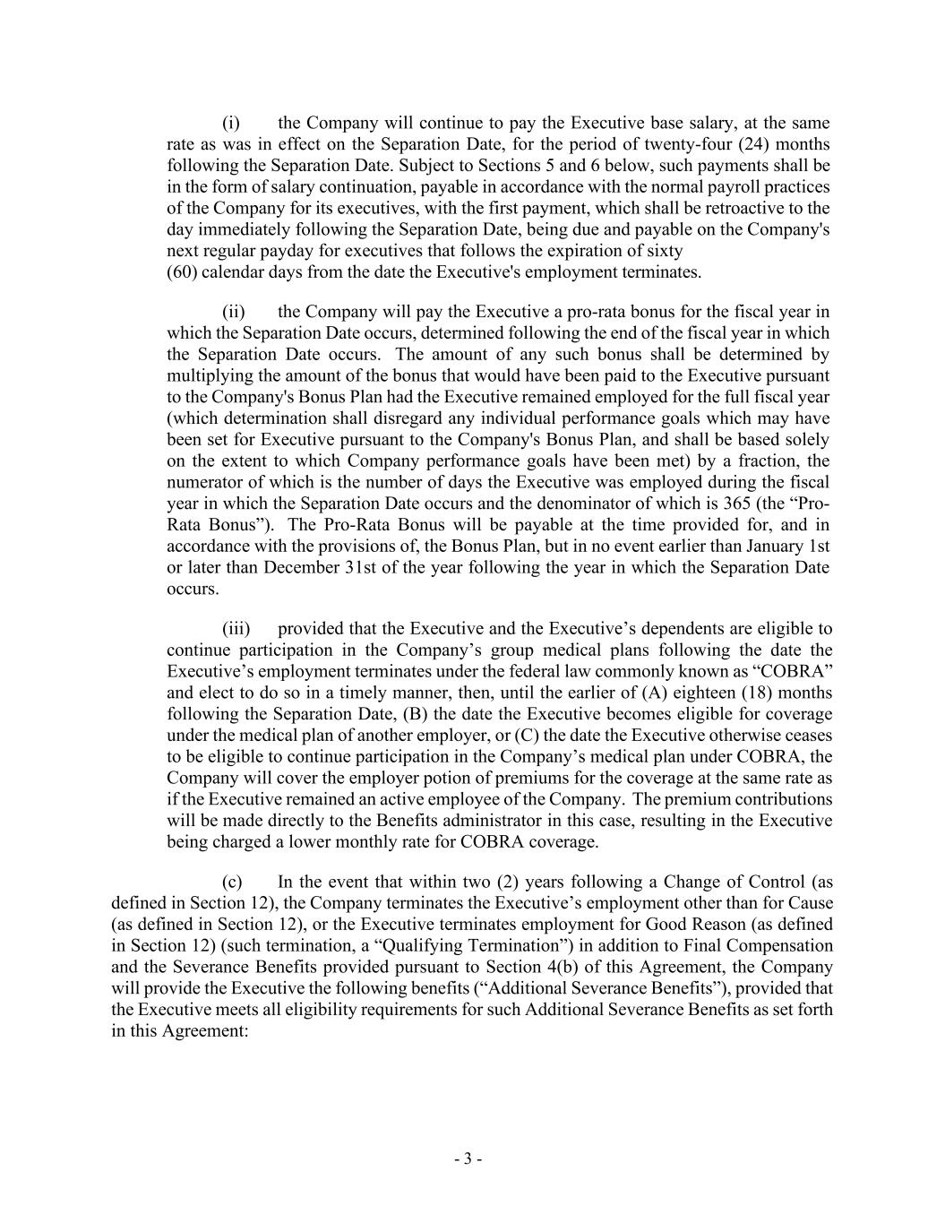 - 3 - (i) the Company will continue to pay the Executive base salary, at the same rate as was in effect on the Separation Date, for the period of twenty-four (24) months following the Separation Date. Subject to Sections 5 and 6 below, such payments shall be in the form of salary continuation, payable in accordance with the normal payroll practices of the Company for its executives, with the first payment, which shall be retroactive to the day immediately following the Separation Date, being due and payable on the Company's next regular payday for executives that follows the expiration of sixty (60) calendar days from the date the Executive's employment terminates. (ii) the Company will pay the Executive a pro-rata bonus for the fiscal year in which the Separation Date occurs, determined following the end of the fiscal year in which the Separation Date occurs. The amount of any such bonus shall be determined by multiplying the amount of the bonus that would have been paid to the Executive pursuant to the Company's Bonus Plan had the Executive remained employed for the full fiscal year (which determination shall disregard any individual performance goals which may have been set for Executive pursuant to the Company's Bonus Plan, and shall be based solely on the extent to which Company performance goals have been met) by a fraction, the numerator of which is the number of days the Executive was employed during the fiscal year in which the Separation Date occurs and the denominator of which is 365 (the “Pro- Rata Bonus”). The Pro-Rata Bonus will be payable at the time provided for, and in accordance with the provisions of, the Bonus Plan, but in no event earlier than January 1st or later than December 31st of the year following the year in which the Separation Date occurs. (iii) provided that the Executive and the Executive’s dependents are eligible to continue participation in the Company’s group medical plans following the date the Executive’s employment terminates under the federal law commonly known as “COBRA” and elect to do so in a timely manner, then, until the earlier of (A) eighteen (18) months following the Separation Date, (B) the date the Executive becomes eligible for coverage under the medical plan of another employer, or (C) the date the Executive otherwise ceases to be eligible to continue participation in the Company’s medical plan under COBRA, the Company will cover the employer potion of premiums for the coverage at the same rate as if the Executive remained an active employee of the Company. The premium contributions will be made directly to the Benefits administrator in this case, resulting in the Executive being charged a lower monthly rate for COBRA coverage. (c) In the event that within two (2) years following a Change of Control (as defined in Section 12), the Company terminates the Executive’s employment other than for Cause (as defined in Section 12), or the Executive terminates employment for Good Reason (as defined in Section 12) (such termination, a “Qualifying Termination”) in addition to Final Compensation and the Severance Benefits provided pursuant to Section 4(b) of this Agreement, the Company will provide the Executive the following benefits (“Additional Severance Benefits”), provided that the Executive meets all eligibility requirements for such Additional Severance Benefits as set forth in this Agreement: