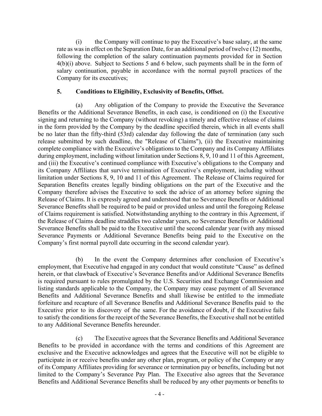 - 4 - (i) the Company will continue to pay the Executive’s base salary, at the same rate as was in effect on the Separation Date, for an additional period of twelve (12) months, following the completion of the salary continuation payments provided for in Section 4(b)(i) above. Subject to Sections 5 and 6 below, such payments shall be in the form of salary continuation, payable in accordance with the normal payroll practices of the Company for its executives; 5. Conditions to Eligibility, Exclusivity of Benefits, Offset. (a) Any obligation of the Company to provide the Executive the Severance Benefits or the Additional Severance Benefits, in each case, is conditioned on (i) the Executive signing and returning to the Company (without revoking) a timely and effective release of claims in the form provided by the Company by the deadline specified therein, which in all events shall be no later than the fifty-third (53rd) calendar day following the date of termination (any such release submitted by such deadline, the "Release of Claims"), (ii) the Executive maintaining complete compliance with the Executive’s obligations to the Company and its Company Affiliates during employment, including without limitation under Sections 8, 9, 10 and 11 of this Agreement, and (iii) the Executive’s continued compliance with Executive’s obligations to the Company and its Company Affiliates that survive termination of Executive’s employment, including without limitation under Sections 8, 9, 10 and 11 of this Agreement. The Release of Claims required for Separation Benefits creates legally binding obligations on the part of the Executive and the Company therefore advises the Executive to seek the advice of an attorney before signing the Release of Claims. It is expressly agreed and understood that no Severance Benefits or Additional Severance Benefits shall be required to be paid or provided unless and until the foregoing Release of Claims requirement is satisfied. Notwithstanding anything to the contrary in this Agreement, if the Release of Claims deadline straddles two calendar years, no Severance Benefits or Additional Severance Benefits shall be paid to the Executive until the second calendar year (with any missed Severance Payments or Additional Severance Benefits being paid to the Executive on the Company’s first normal payroll date occurring in the second calendar year). (b) In the event the Company determines after conclusion of Executive’s employment, that Executive had engaged in any conduct that would constitute “Cause” as defined herein, or that clawback of Executive’s Severance Benefits and/or Additional Severance Benefits is required pursuant to rules promulgated by the U.S. Securities and Exchange Commission and listing standards applicable to the Company, the Company may cease payment of all Severance Benefits and Additional Severance Benefits and shall likewise be entitled to the immediate forfeiture and recapture of all Severance Benefits and Additional Severance Benefits paid to the Executive prior to its discovery of the same. For the avoidance of doubt, if the Executive fails to satisfy the conditions for the receipt of the Severance Benefits, the Executive shall not be entitled to any Additional Severance Benefits hereunder. (c) The Executive agrees that the Severance Benefits and Additional Severance Benefits to be provided in accordance with the terms and conditions of this Agreement are exclusive and the Executive acknowledges and agrees that the Executive will not be eligible to participate in or receive benefits under any other plan, program, or policy of the Company or any of its Company Affiliates providing for severance or termination pay or benefits, including but not limited to the Company’s Severance Pay Plan. The Executive also agrees that the Severance Benefits and Additional Severance Benefits shall be reduced by any other payments or benefits to