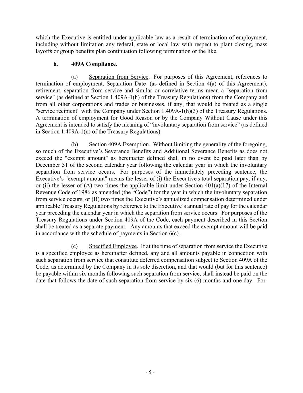 - 5 - which the Executive is entitled under applicable law as a result of termination of employment, including without limitation any federal, state or local law with respect to plant closing, mass layoffs or group benefits plan continuation following termination or the like. 6. 409A Compliance. (a) Separation from Service. For purposes of this Agreement, references to termination of employment, Separation Date (as defined in Section 4(a) of this Agreement), retirement, separation from service and similar or correlative terms mean a "separation from service" (as defined at Section 1.409A-1(h) of the Treasury Regulations) from the Company and from all other corporations and trades or businesses, if any, that would be treated as a single "service recipient" with the Company under Section 1.409A-1(h)(3) of the Treasury Regulations. A termination of employment for Good Reason or by the Company Without Cause under this Agreement is intended to satisfy the meaning of “involuntary separation from service” (as defined in Section 1.409A-1(n) of the Treasury Regulations). (b) Section 409A Exemption. Without limiting the generality of the foregoing, so much of the Executive’s Severance Benefits and Additional Severance Benefits as does not exceed the "exempt amount" as hereinafter defined shall in no event be paid later than by December 31 of the second calendar year following the calendar year in which the involuntary separation from service occurs. For purposes of the immediately preceding sentence, the Executive’s "exempt amount" means the lesser of (i) the Executive's total separation pay, if any, or (ii) the lesser of (A) two times the applicable limit under Section 401(a)(17) of the Internal Revenue Code of 1986 as amended (the “Code”) for the year in which the involuntary separation from service occurs, or (B) two times the Executive’s annualized compensation determined under applicable Treasury Regulations by reference to the Executive’s annual rate of pay for the calendar year preceding the calendar year in which the separation from service occurs. For purposes of the Treasury Regulations under Section 409A of the Code, each payment described in this Section shall be treated as a separate payment. Any amounts that exceed the exempt amount will be paid in accordance with the schedule of payments in Section 6(c). (c) Specified Employee. If at the time of separation from service the Executive is a specified employee as hereinafter defined, any and all amounts payable in connection with such separation from service that constitute deferred compensation subject to Section 409A of the Code, as determined by the Company in its sole discretion, and that would (but for this sentence) be payable within six months following such separation from service, shall instead be paid on the date that follows the date of such separation from service by six (6) months and one day. For