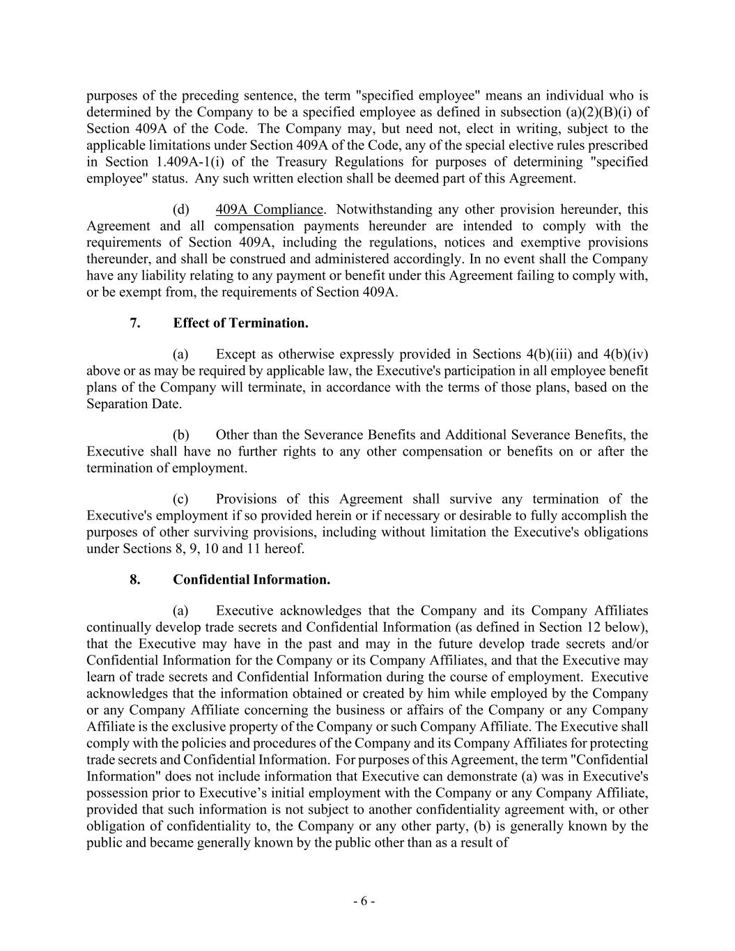 - 6 - purposes of the preceding sentence, the term "specified employee" means an individual who is determined by the Company to be a specified employee as defined in subsection (a)(2)(B)(i) of Section 409A of the Code. The Company may, but need not, elect in writing, subject to the applicable limitations under Section 409A of the Code, any of the special elective rules prescribed in Section 1.409A-1(i) of the Treasury Regulations for purposes of determining "specified employee" status. Any such written election shall be deemed part of this Agreement. (d) 409A Compliance. Notwithstanding any other provision hereunder, this Agreement and all compensation payments hereunder are intended to comply with the requirements of Section 409A, including the regulations, notices and exemptive provisions thereunder, and shall be construed and administered accordingly. In no event shall the Company have any liability relating to any payment or benefit under this Agreement failing to comply with, or be exempt from, the requirements of Section 409A. 7. Effect of Termination. (a) Except as otherwise expressly provided in Sections 4(b)(iii) and 4(b)(iv) above or as may be required by applicable law, the Executive's participation in all employee benefit plans of the Company will terminate, in accordance with the terms of those plans, based on the Separation Date. (b) Other than the Severance Benefits and Additional Severance Benefits, the Executive shall have no further rights to any other compensation or benefits on or after the termination of employment. (c) Provisions of this Agreement shall survive any termination of the Executive's employment if so provided herein or if necessary or desirable to fully accomplish the purposes of other surviving provisions, including without limitation the Executive's obligations under Sections 8, 9, 10 and 11 hereof. 8. Confidential Information. (a) Executive acknowledges that the Company and its Company Affiliates continually develop trade secrets and Confidential Information (as defined in Section 12 below), that the Executive may have in the past and may in the future develop trade secrets and/or Confidential Information for the Company or its Company Affiliates, and that the Executive may learn of trade secrets and Confidential Information during the course of employment. Executive acknowledges that the information obtained or created by him while employed by the Company or any Company Affiliate concerning the business or affairs of the Company or any Company Affiliate is the exclusive property of the Company or such Company Affiliate. The Executive shall comply with the policies and procedures of the Company and its Company Affiliates for protecting trade secrets and Confidential Information. For purposes of this Agreement, the term "Confidential Information" does not include information that Executive can demonstrate (a) was in Executive's possession prior to Executive’s initial employment with the Company or any Company Affiliate, provided that such information is not subject to another confidentiality agreement with, or other obligation of confidentiality to, the Company or any other party, (b) is generally known by the public and became generally known by the public other than as a result of