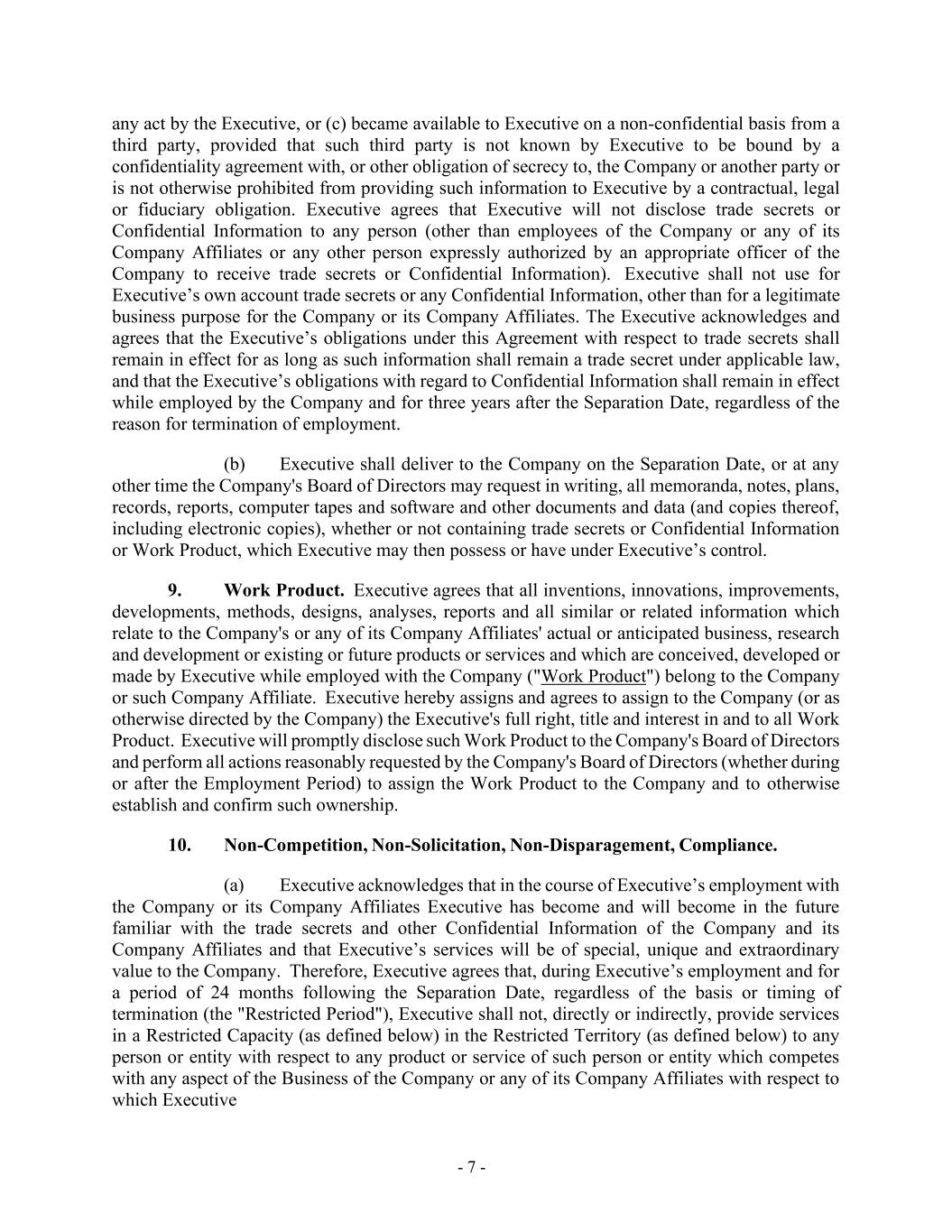 - 7 - any act by the Executive, or (c) became available to Executive on a non-confidential basis from a third party, provided that such third party is not known by Executive to be bound by a confidentiality agreement with, or other obligation of secrecy to, the Company or another party or is not otherwise prohibited from providing such information to Executive by a contractual, legal or fiduciary obligation. Executive agrees that Executive will not disclose trade secrets or Confidential Information to any person (other than employees of the Company or any of its Company Affiliates or any other person expressly authorized by an appropriate officer of the Company to receive trade secrets or Confidential Information). Executive shall not use for Executive’s own account trade secrets or any Confidential Information, other than for a legitimate business purpose for the Company or its Company Affiliates. The Executive acknowledges and agrees that the Executive’s obligations under this Agreement with respect to trade secrets shall remain in effect for as long as such information shall remain a trade secret under applicable law, and that the Executive’s obligations with regard to Confidential Information shall remain in effect while employed by the Company and for three years after the Separation Date, regardless of the reason for termination of employment. (b) Executive shall deliver to the Company on the Separation Date, or at any other time the Company's Board of Directors may request in writing, all memoranda, notes, plans, records, reports, computer tapes and software and other documents and data (and copies thereof, including electronic copies), whether or not containing trade secrets or Confidential Information or Work Product, which Executive may then possess or have under Executive’s control. 9. Work Product. Executive agrees that all inventions, innovations, improvements, developments, methods, designs, analyses, reports and all similar or related information which relate to the Company's or any of its Company Affiliates' actual or anticipated business, research and development or existing or future products or services and which are conceived, developed or made by Executive while employed with the Company ("Work Product") belong to the Company or such Company Affiliate. Executive hereby assigns and agrees to assign to the Company (or as otherwise directed by the Company) the Executive's full right, title and interest in and to all Work Product. Executive will promptly disclose such Work Product to the Company's Board of Directors and perform all actions reasonably requested by the Company's Board of Directors (whether during or after the Employment Period) to assign the Work Product to the Company and to otherwise establish and confirm such ownership. 10. Non-Competition, Non-Solicitation, Non-Disparagement, Compliance. (a) Executive acknowledges that in the course of Executive’s employment with the Company or its Company Affiliates Executive has become and will become in the future familiar with the trade secrets and other Confidential Information of the Company and its Company Affiliates and that Executive’s services will be of special, unique and extraordinary value to the Company. Therefore, Executive agrees that, during Executive’s employment and for a period of 24 months following the Separation Date, regardless of the basis or timing of termination (the "Restricted Period"), Executive shall not, directly or indirectly, provide services in a Restricted Capacity (as defined below) in the Restricted Territory (as defined below) to any person or entity with respect to any product or service of such person or entity which competes with any aspect of the Business of the Company or any of its Company Affiliates with respect to which Executive