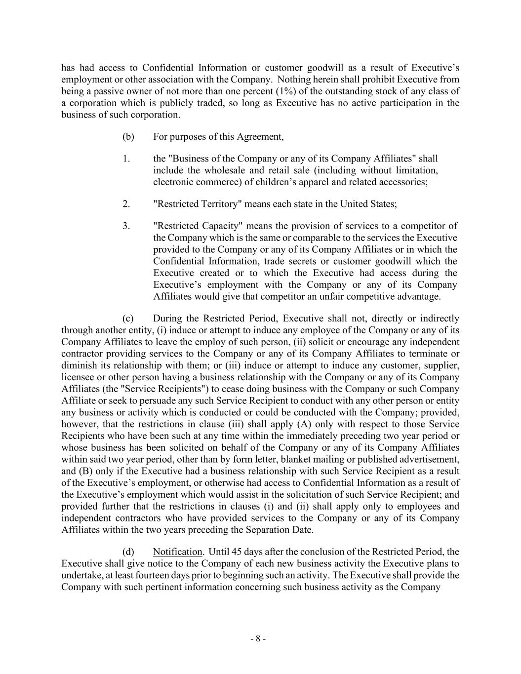 - 8 - has had access to Confidential Information or customer goodwill as a result of Executive’s employment or other association with the Company. Nothing herein shall prohibit Executive from being a passive owner of not more than one percent (1%) of the outstanding stock of any class of a corporation which is publicly traded, so long as Executive has no active participation in the business of such corporation. (b) For purposes of this Agreement, 1. the "Business of the Company or any of its Company Affiliates" shall include the wholesale and retail sale (including without limitation, electronic commerce) of children’s apparel and related accessories; 2. "Restricted Territory" means each state in the United States; 3. "Restricted Capacity" means the provision of services to a competitor of the Company which is the same or comparable to the services the Executive provided to the Company or any of its Company Affiliates or in which the Confidential Information, trade secrets or customer goodwill which the Executive created or to which the Executive had access during the Executive’s employment with the Company or any of its Company Affiliates would give that competitor an unfair competitive advantage. (c) During the Restricted Period, Executive shall not, directly or indirectly through another entity, (i) induce or attempt to induce any employee of the Company or any of its Company Affiliates to leave the employ of such person, (ii) solicit or encourage any independent contractor providing services to the Company or any of its Company Affiliates to terminate or diminish its relationship with them; or (iii) induce or attempt to induce any customer, supplier, licensee or other person having a business relationship with the Company or any of its Company Affiliates (the "Service Recipients") to cease doing business with the Company or such Company Affiliate or seek to persuade any such Service Recipient to conduct with any other person or entity any business or activity which is conducted or could be conducted with the Company; provided, however, that the restrictions in clause (iii) shall apply (A) only with respect to those Service Recipients who have been such at any time within the immediately preceding two year period or whose business has been solicited on behalf of the Company or any of its Company Affiliates within said two year period, other than by form letter, blanket mailing or published advertisement, and (B) only if the Executive had a business relationship with such Service Recipient as a result of the Executive’s employment, or otherwise had access to Confidential Information as a result of the Executive’s employment which would assist in the solicitation of such Service Recipient; and provided further that the restrictions in clauses (i) and (ii) shall apply only to employees and independent contractors who have provided services to the Company or any of its Company Affiliates within the two years preceding the Separation Date. (d) Notification. Until 45 days after the conclusion of the Restricted Period, the Executive shall give notice to the Company of each new business activity the Executive plans to undertake, at least fourteen days prior to beginning such an activity. The Executive shall provide the Company with such pertinent information concerning such business activity as the Company