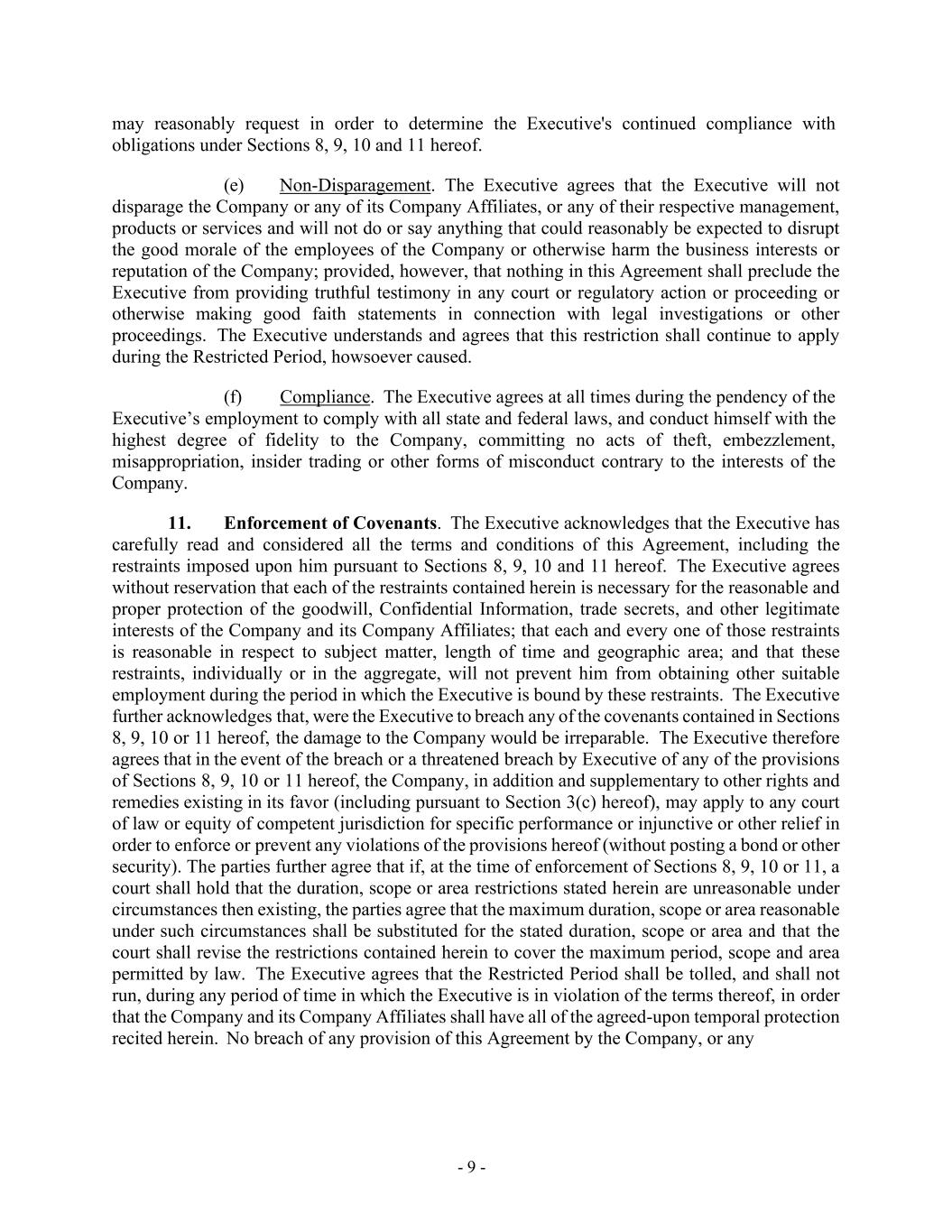 - 9 - may reasonably request in order to determine the Executive's continued compliance with obligations under Sections 8, 9, 10 and 11 hereof. (e) Non-Disparagement. The Executive agrees that the Executive will not disparage the Company or any of its Company Affiliates, or any of their respective management, products or services and will not do or say anything that could reasonably be expected to disrupt the good morale of the employees of the Company or otherwise harm the business interests or reputation of the Company; provided, however, that nothing in this Agreement shall preclude the Executive from providing truthful testimony in any court or regulatory action or proceeding or otherwise making good faith statements in connection with legal investigations or other proceedings. The Executive understands and agrees that this restriction shall continue to apply during the Restricted Period, howsoever caused. (f) Compliance. The Executive agrees at all times during the pendency of the Executive’s employment to comply with all state and federal laws, and conduct himself with the highest degree of fidelity to the Company, committing no acts of theft, embezzlement, misappropriation, insider trading or other forms of misconduct contrary to the interests of the Company. 11. Enforcement of Covenants. The Executive acknowledges that the Executive has carefully read and considered all the terms and conditions of this Agreement, including the restraints imposed upon him pursuant to Sections 8, 9, 10 and 11 hereof. The Executive agrees without reservation that each of the restraints contained herein is necessary for the reasonable and proper protection of the goodwill, Confidential Information, trade secrets, and other legitimate interests of the Company and its Company Affiliates; that each and every one of those restraints is reasonable in respect to subject matter, length of time and geographic area; and that these restraints, individually or in the aggregate, will not prevent him from obtaining other suitable employment during the period in which the Executive is bound by these restraints. The Executive further acknowledges that, were the Executive to breach any of the covenants contained in Sections 8, 9, 10 or 11 hereof, the damage to the Company would be irreparable. The Executive therefore agrees that in the event of the breach or a threatened breach by Executive of any of the provisions of Sections 8, 9, 10 or 11 hereof, the Company, in addition and supplementary to other rights and remedies existing in its favor (including pursuant to Section 3(c) hereof), may apply to any court of law or equity of competent jurisdiction for specific performance or injunctive or other relief in order to enforce or prevent any violations of the provisions hereof (without posting a bond or other security). The parties further agree that if, at the time of enforcement of Sections 8, 9, 10 or 11, a court shall hold that the duration, scope or area restrictions stated herein are unreasonable under circumstances then existing, the parties agree that the maximum duration, scope or area reasonable under such circumstances shall be substituted for the stated duration, scope or area and that the court shall revise the restrictions contained herein to cover the maximum period, scope and area permitted by law. The Executive agrees that the Restricted Period shall be tolled, and shall not run, during any period of time in which the Executive is in violation of the terms thereof, in order that the Company and its Company Affiliates shall have all of the agreed-upon temporal protection recited herein. No breach of any provision of this Agreement by the Company, or any