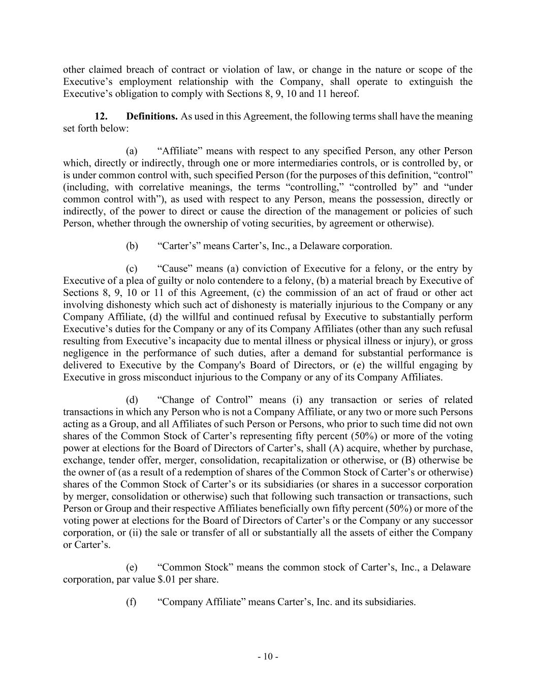 - 10 - other claimed breach of contract or violation of law, or change in the nature or scope of the Executive’s employment relationship with the Company, shall operate to extinguish the Executive’s obligation to comply with Sections 8, 9, 10 and 11 hereof. 12. Definitions. As used in this Agreement, the following terms shall have the meaning set forth below: (a) “Affiliate” means with respect to any specified Person, any other Person which, directly or indirectly, through one or more intermediaries controls, or is controlled by, or is under common control with, such specified Person (for the purposes of this definition, “control” (including, with correlative meanings, the terms “controlling,” “controlled by” and “under common control with”), as used with respect to any Person, means the possession, directly or indirectly, of the power to direct or cause the direction of the management or policies of such Person, whether through the ownership of voting securities, by agreement or otherwise). (b) “Carter’s” means Carter’s, Inc., a Delaware corporation. (c) “Cause” means (a) conviction of Executive for a felony, or the entry by Executive of a plea of guilty or nolo contendere to a felony, (b) a material breach by Executive of Sections 8, 9, 10 or 11 of this Agreement, (c) the commission of an act of fraud or other act involving dishonesty which such act of dishonesty is materially injurious to the Company or any Company Affiliate, (d) the willful and continued refusal by Executive to substantially perform Executive’s duties for the Company or any of its Company Affiliates (other than any such refusal resulting from Executive’s incapacity due to mental illness or physical illness or injury), or gross negligence in the performance of such duties, after a demand for substantial performance is delivered to Executive by the Company's Board of Directors, or (e) the willful engaging by Executive in gross misconduct injurious to the Company or any of its Company Affiliates. (d) “Change of Control” means (i) any transaction or series of related transactions in which any Person who is not a Company Affiliate, or any two or more such Persons acting as a Group, and all Affiliates of such Person or Persons, who prior to such time did not own shares of the Common Stock of Carter’s representing fifty percent (50%) or more of the voting power at elections for the Board of Directors of Carter’s, shall (A) acquire, whether by purchase, exchange, tender offer, merger, consolidation, recapitalization or otherwise, or (B) otherwise be the owner of (as a result of a redemption of shares of the Common Stock of Carter’s or otherwise) shares of the Common Stock of Carter’s or its subsidiaries (or shares in a successor corporation by merger, consolidation or otherwise) such that following such transaction or transactions, such Person or Group and their respective Affiliates beneficially own fifty percent (50%) or more of the voting power at elections for the Board of Directors of Carter’s or the Company or any successor corporation, or (ii) the sale or transfer of all or substantially all the assets of either the Company or Carter’s. (e) “Common Stock” means the common stock of Carter’s, Inc., a Delaware corporation, par value $.01 per share. (f) “Company Affiliate” means Carter’s, Inc. and its subsidiaries.