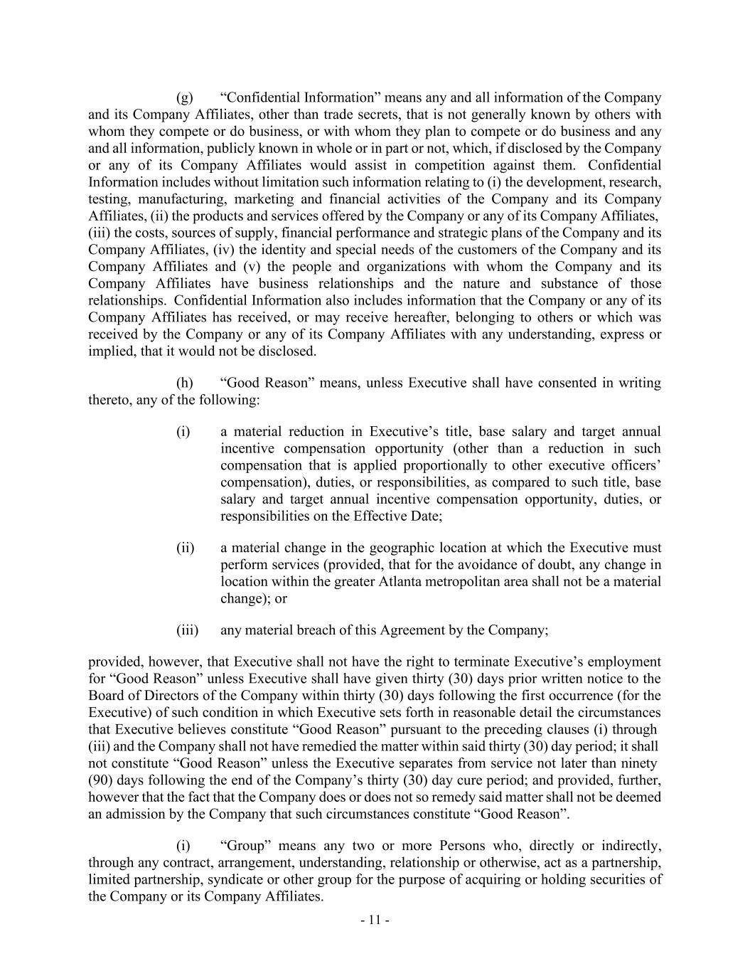 - 11 - (g) “Confidential Information” means any and all information of the Company and its Company Affiliates, other than trade secrets, that is not generally known by others with whom they compete or do business, or with whom they plan to compete or do business and any and all information, publicly known in whole or in part or not, which, if disclosed by the Company or any of its Company Affiliates would assist in competition against them. Confidential Information includes without limitation such information relating to (i) the development, research, testing, manufacturing, marketing and financial activities of the Company and its Company Affiliates, (ii) the products and services offered by the Company or any of its Company Affiliates, (iii) the costs, sources of supply, financial performance and strategic plans of the Company and its Company Affiliates, (iv) the identity and special needs of the customers of the Company and its Company Affiliates and (v) the people and organizations with whom the Company and its Company Affiliates have business relationships and the nature and substance of those relationships. Confidential Information also includes information that the Company or any of its Company Affiliates has received, or may receive hereafter, belonging to others or which was received by the Company or any of its Company Affiliates with any understanding, express or implied, that it would not be disclosed. (h) “Good Reason” means, unless Executive shall have consented in writing thereto, any of the following: (i) a material reduction in Executive’s title, base salary and target annual incentive compensation opportunity (other than a reduction in such compensation that is applied proportionally to other executive officers’ compensation), duties, or responsibilities, as compared to such title, base salary and target annual incentive compensation opportunity, duties, or responsibilities on the Effective Date; (ii) a material change in the geographic location at which the Executive must perform services (provided, that for the avoidance of doubt, any change in location within the greater Atlanta metropolitan area shall not be a material change); or (iii) any material breach of this Agreement by the Company; provided, however, that Executive shall not have the right to terminate Executive’s employment for “Good Reason” unless Executive shall have given thirty (30) days prior written notice to the Board of Directors of the Company within thirty (30) days following the first occurrence (for the Executive) of such condition in which Executive sets forth in reasonable detail the circumstances that Executive believes constitute “Good Reason” pursuant to the preceding clauses (i) through (iii) and the Company shall not have remedied the matter within said thirty (30) day period; it shall not constitute “Good Reason” unless the Executive separates from service not later than ninety (90) days following the end of the Company’s thirty (30) day cure period; and provided, further, however that the fact that the Company does or does not so remedy said matter shall not be deemed an admission by the Company that such circumstances constitute “Good Reason”. (i) “Group” means any two or more Persons who, directly or indirectly, through any contract, arrangement, understanding, relationship or otherwise, act as a partnership, limited partnership, syndicate or other group for the purpose of acquiring or holding securities of the Company or its Company Affiliates.