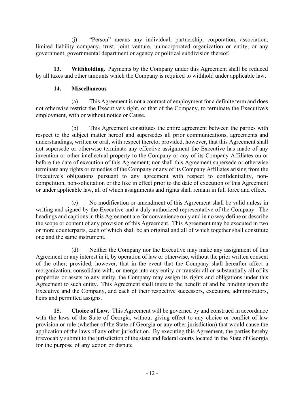 - 12 - (j) “Person” means any individual, partnership, corporation, association, limited liability company, trust, joint venture, unincorporated organization or entity, or any government, governmental department or agency or political subdivision thereof. 13. Withholding. Payments by the Company under this Agreement shall be reduced by all taxes and other amounts which the Company is required to withhold under applicable law. 14. Miscellaneous (a) This Agreement is not a contract of employment for a definite term and does not otherwise restrict the Executive's right, or that of the Company, to terminate the Executive's employment, with or without notice or Cause. (b) This Agreement constitutes the entire agreement between the parties with respect to the subject matter hereof and supersedes all prior communications, agreements and understandings, written or oral, with respect thereto; provided, however, that this Agreement shall not supersede or otherwise terminate any effective assignment the Executive has made of any invention or other intellectual property to the Company or any of its Company Affiliates on or before the date of execution of this Agreement; nor shall this Agreement supersede or otherwise terminate any rights or remedies of the Company or any of its Company Affiliates arising from the Executive's obligations pursuant to any agreement with respect to confidentiality, non- competition, non-solicitation or the like in effect prior to the date of execution of this Agreement or under applicable law, all of which assignments and rights shall remain in full force and effect. (c) No modification or amendment of this Agreement shall be valid unless in writing and signed by the Executive and a duly authorized representative of the Company. The headings and captions in this Agreement are for convenience only and in no way define or describe the scope or content of any provision of this Agreement. This Agreement may be executed in two or more counterparts, each of which shall be an original and all of which together shall constitute one and the same instrument. (d) Neither the Company nor the Executive may make any assignment of this Agreement or any interest in it, by operation of law or otherwise, without the prior written consent of the other; provided, however, that in the event that the Company shall hereafter affect a reorganization, consolidate with, or merge into any entity or transfer all or substantially all of its properties or assets to any entity, the Company may assign its rights and obligations under this Agreement to such entity. This Agreement shall inure to the benefit of and be binding upon the Executive and the Company, and each of their respective successors, executors, administrators, heirs and permitted assigns. 15. Choice of Law. This Agreement will be governed by and construed in accordance with the laws of the State of Georgia, without giving effect to any choice or conflict of law provision or rule (whether of the State of Georgia or any other jurisdiction) that would cause the application of the laws of any other jurisdiction. By executing this Agreement, the parties hereby irrevocably submit to the jurisdiction of the state and federal courts located in the State of Georgia for the purpose of any action or dispute