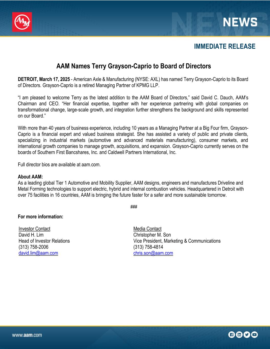 AAM Names Terry Grayson-Caprio to Board of Directors DETROIT, March 17, 2025 - American Axle & Manufacturing (NYSE: AXL) has named Terry Grayson-Caprio to its Board of Directors. Grayson-Caprio is a retired Managing Partner of KPMG LLP. “I am pleased to welcome Terry as the latest addition to the AAM Board of Directors,” said David C. Dauch, AAM’s Chairman and CEO. “Her financial expertise, together with her experience partnering with global companies on transformational change, large-scale growth, and integration further strengthens the background and skills represented on our Board.” With more than 40 years of business experience, including 10 years as a Managing Partner at a Big Four firm, Grayson- Caprio is a financial expert and valued business strategist. She has assisted a variety of public and private clients, specializing in industrial markets (automotive and advanced materials manufacturing), consumer markets, and international growth companies to manage growth, acquisitions, and expansion. Grayson-Caprio currently serves on the boards of Southern First Bancshares, Inc. and Caldwell Partners International, Inc. Full director bios are available at aam.com. About AAM: As a leading global Tier 1 Automotive and Mobility Supplier, AAM designs, engineers and manufactures Driveline and Metal Forming technologies to support electric, hybrid and internal combustion vehicles. Headquartered in Detroit with over 75 facilities in 16 countries, AAM is bringing the future faster for a safer and more sustainable tomorrow. ### For more information: Investor Contact David H. Lim Head of Investor Relations (313) 758-2006 david.lim@aam.com Media Contact Christopher M. Son Vice President, Marketing & Communications (313) 758-4814 chris.son@aam.com IMMEDIATE RELEASE