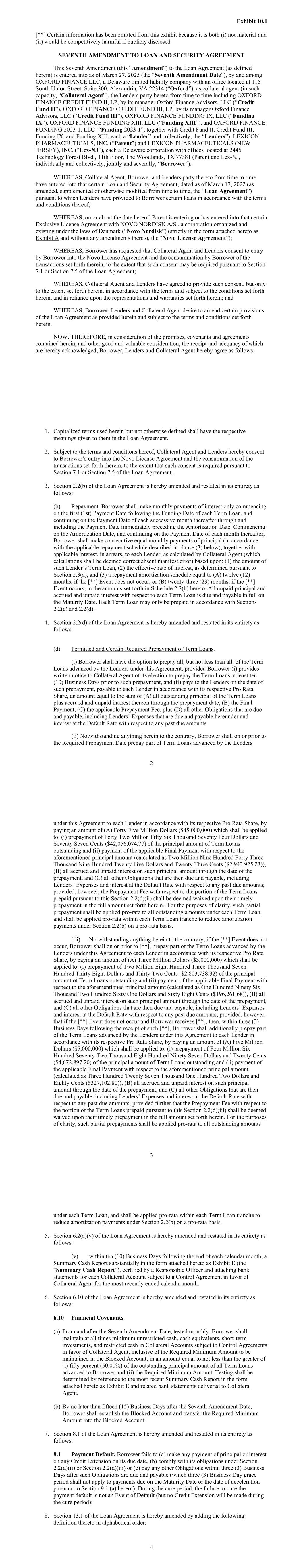 Exhibit 10.1 [**] Certain information has been omitted from this exhibit because it is both (i) not material and (ii) would be competitively harmful if publicly disclosed. SEVENTH AMENDMENT TO LOAN AND SECURITY AGREEMENT This Seventh Amendment (this “Amendment”) to the Loan Agreement (as defined herein) is entered into as of March 27, 2025 (the “Seventh Amendment Date”), by and among OXFORD FINANCE LLC, a Delaware limited liability company with an office located at 115 South Union Street, Suite 300, Alexandria, VA 22314 (“Oxford”), as collateral agent (in such capacity, “Collateral Agent”), the Lenders party hereto from time to time including OXFORD FINANCE CREDIT FUND II, LP, by its manager Oxford Finance Advisors, LLC (“Credit Fund II”), OXFORD FINANCE CREDIT FUND III, LP, by its manager Oxford Finance Advisors, LLC (“Credit Fund III”), OXFORD FINANCE FUNDING IX, LLC (“Funding IX”), OXFORD FINANCE FUNDING XIII, LLC (“Funding XIII”), and OXFORD FINANCE FUNDING 2023-1, LLC (“Funding 2023-1”; together with Credit Fund II, Credit Fund III, Funding IX, and Funding XIII, each a “Lender” and collectively, the “Lenders”), LEXICON PHARMACEUTICALS, INC. (“Parent”) and LEXICON PHARMACEUTICALS (NEW JERSEY), INC. (“Lex-NJ”), each a Delaware corporation with offices located at 2445 Technology Forest Blvd., 11th Floor, The Woodlands, TX 77381 (Parent and Lex-NJ, individually and collectively, jointly and severally, “Borrower”). WHEREAS, Collateral Agent, Borrower and Lenders party thereto from time to time have entered into that certain Loan and Security Agreement, dated as of March 17, 2022 (as amended, supplemented or otherwise modified from time to time, the “Loan Agreement”) pursuant to which Lenders have provided to Borrower certain loans in accordance with the terms and conditions thereof; WHEREAS, on or about the date hereof, Parent is entering or has entered into that certain Exclusive License Agreement with NOVO NORDISK A/S., a corporation organized and existing under the laws of Denmark (“Novo Nordisk”) (strictly in the form attached hereto as Exhibit A and without any amendments thereto, the “Novo License Agreement”); WHEREAS, Borrower has requested that Collateral Agent and Lenders consent to entry by Borrower into the Novo License Agreement and the consummation by Borrower of the transactions set forth therein, to the extent that such consent may be required pursuant to Section 7.1 or Section 7.5 of the Loan Agreement; WHEREAS, Collateral Agent and Lenders have agreed to provide such consent, but only to the extent set forth herein, in accordance with the terms and subject to the conditions set forth herein, and in reliance upon the representations and warranties set forth herein; and WHEREAS, Borrower, Lenders and Collateral Agent desire to amend certain provisions of the Loan Agreement as provided herein and subject to the terms and conditions set forth herein. NOW, THEREFORE, in consideration of the promises, covenants and agreements contained herein, and other good and valuable consideration, the receipt and adequacy of which are hereby acknowledged, Borrower, Lenders and Collateral Agent hereby agree as follows: 2 1. Capitalized terms used herein but not otherwise defined shall have the respective meanings given to them in the Loan Agreement. 2. Subject to the terms and conditions hereof, Collateral Agent and Lenders hereby consent to Borrower’s entry into the Novo License Agreement and the consummation of the transactions set forth therein, to the extent that such consent is required pursuant to Section 7.1 or Section 7.5 of the Loan Agreement. 3. Section 2.2(b) of the Loan Agreement is hereby amended and restated in its entirety as follows: (b) Repayment. Borrower shall make monthly payments of interest only commencing on the first (1st) Payment Date following the Funding Date of each Term Loan, and continuing on the Payment Date of each successive month thereafter through and including the Payment Date immediately preceding the Amortization Date. Commencing on the Amortization Date, and continuing on the Payment Date of each month thereafter, Borrower shall make consecutive equal monthly payments of principal (in accordance with the applicable repayment schedule described in clause (3) below), together with applicable interest, in arrears, to each Lender, as calculated by Collateral Agent (which calculations shall be deemed correct absent manifest error) based upon: (1) the amount of such Lender’s Term Loan, (2) the effective rate of interest, as determined pursuant to Section 2.3(a), and (3) a repayment amortization schedule equal to (A) twelve (12) months, if the [**] Event does not occur, or (B) twenty-three (23) months, if the [**] Event occurs, in the amounts set forth in Schedule 2.2(b) hereto. All unpaid principal and accrued and unpaid interest with respect to each Term Loan is due and payable in full on the Maturity Date. Each Term Loan may only be prepaid in accordance with Sections 2.2(c) and 2.2(d). 4. Section 2.2(d) of the Loan Agreement is hereby amended and restated in its entirety as follows: (d) Permitted and Certain Required Prepayment of Term Loans. (i) Borrower shall have the option to prepay all, but not less than all, of the Term Loans advanced by the Lenders under this Agreement, provided Borrower (i) provides written notice to Collateral Agent of its election to prepay the Term Loans at least ten (10) Business Days prior to such prepayment, and (ii) pays to the Lenders on the date of such prepayment, payable to each Lender in accordance with its respective Pro Rata Share, an amount equal to the sum of (A) all outstanding principal of the Term Loans plus accrued and unpaid interest thereon through the prepayment date, (B) the Final Payment, (C) the applicable Prepayment Fee, plus (D) all other Obligations that are due and payable, including Lenders’ Expenses that are due and payable h