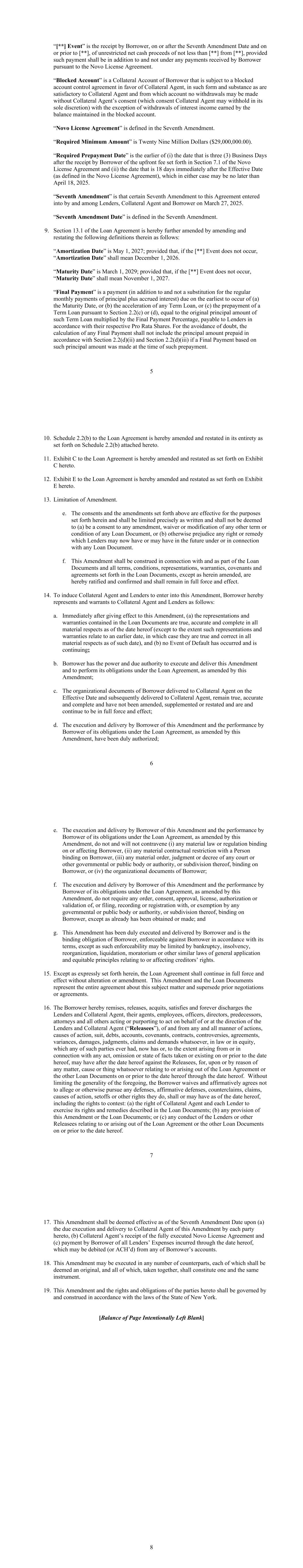 5 “[**] Event” is the receipt by Borrower, on or after the Seventh Amendment Date and on or prior to [**], of unrestricted net cash proceeds of not less than [**] from [**], provided such payment shall be in addition to and not under any payments received by Borrower pursuant to the Novo License Agreement. “Blocked Account” is a Collateral Account of Borrower that is subject to a blocked account control agreement in favor of Collateral Agent, in such form and substance as are satisfactory to Collateral Agent and from which account no withdrawals may be made without Collateral Agent’s consent (which consent Collateral Agent may withhold in its sole discretion) with the exception of withdrawals of interest income earned by the balance maintained in the blocked account. “Novo License Agreement” is defined in the Seventh Amendment. “Required Minimum Amount” is Twenty Nine Million Dollars ($29,000,000.00). “Required Prepayment Date” is the earlier of (i) the date that is three (3) Business Days after the receipt by Borrower of the upfront fee set forth in Section 7.1 of the Novo License Agreement and (ii) the date that is 18 days immediately after the Effective Date (as defined in the Novo License Agreement), which in either case may be no later than April 18, 2025. “Seventh Amendment” is that certain Seventh Amendment to this Agreement entered into by and among Lenders, Collateral Agent and Borrower on March 27, 2025. “Seventh Amendment Date” is defined in the Seventh Amendment. 9. Section 13.1 of the Loan Agreement is hereby further amended by amending and restating the following definitions therein as follows: “Amortization Date” is May 1, 2027; provided that, if the [**] Event does not occur, “Amortization Date” shall mean December 1, 2026. “Maturity Date” is March 1, 2029; provided that, if the [**] Event does not occur, “Maturity Date” shall mean November 1, 2027. “Final Payment” is a payment (in addition to and not a substitution for the regular monthly payments of principal plus accrued interest) due on the earliest to occur of (a) the Maturity Date, or (b) the acceleration of any Term Loan, or (c) the prepayment of a Term Loan pursuant to Section 2.2(c) or (d), equal to the original principal amount of such Term Loan multiplied by the Final Payment Percentage, payable to Lenders in accordance with their respective Pro Rata Shares. For the avoidance of doubt, the calculation of any Final Payment shall not include the principal amount prepaid in accordance with Section 2.2(d)(ii) and Section 2.2(d)(iii) if a Final Payment based on such principal amount was made at the time of such prepayment. 6 10. Schedule 2.2(b) to the Loan Agreement is hereby amended and restated in its entirety as set forth on Schedule 2.2(b) attached hereto. 11. Exhibit C to the Loan Agreement is hereby amended and restated as set forth on Exhibit C hereto. 12. Exhibit E to the Loan Agreement is hereby amended and restated as set forth on Exhibit E hereto. 13. Limitation of Amendment. e. The consents and the amendments set forth above are effective for the purposes set forth herein and shall be limited precisely as written and shall not be deemed to (a) be a consent to any amendment, waiver or modification of any other term or condition of any Loan Document, or (b) otherwise prejudice any right or remedy which Lenders may now have or may have in the future under or in connection with any Loan Document. f. This Amendment shall be construed in connection with and as part of the Loan Documents and all terms, conditions, representations, warranties, covenants and agreements set forth in the Loan Documents, except as herein amended, are hereby ratified and confirmed and shall remain in full force and effect. 14. To induce Collateral Agent and Lenders to enter into this Amendment, Borrower hereby represents and warrants to Collateral Agent and Lenders as follows: a. Immediately after giving effect to this Amendment, (a) the representations and warranties contained in the Loan Documents are true, accurate and complete in all material respects as of the date hereof (except to the extent such representations and warranties relate to an earlier date, in which case they are true and correct in all material respects as of such date), and (b) no Event of Default has occurred and is continuing; b. Borrower has the power and due authority to execute and deliver this Amendment and to perform its obligations under the Loan Agreement, as amended by this Amendment; c. The organizational documents of Borrower delivered to Collateral Agent on the Effective Date and subsequently delivered to Collateral Agent, remain true, accurate and complete and have not been amended, supplemented or restated and are and continue to be in full force and effect; d. The execution and delivery by Borrower of this Amendment and the performance by Borrower of its obligations under the Loan Agreement, as amended by this Amendment, have been duly authorized; 7 e. The execution and delivery by Borrower of this Amendment and the performance by Borrower of its obligations under the Loan Agreement, as amended by this Amendment, do not and will not contravene (i) any material law or regulation binding on or affecting Borrower, (ii) any material contractual restriction with a Person binding on Borrower, (iii) any material order, judgment or decree of any court or other governmental or public body or authority, or subdivision thereof, binding on Borrower, or (iv) the organizational documents of Borrower; f. The execution and delivery by Borrower of this Amendment and the performance by Borrower of its obligations under the Loan Agreement, as amended by this Amendment, do not require any order, consent, approval, license, authorization or validation of, or filing, recording or registration with, or exemption by any governmental or public body or authority, or subdivision thereof, binding on Borrower, except as alrea