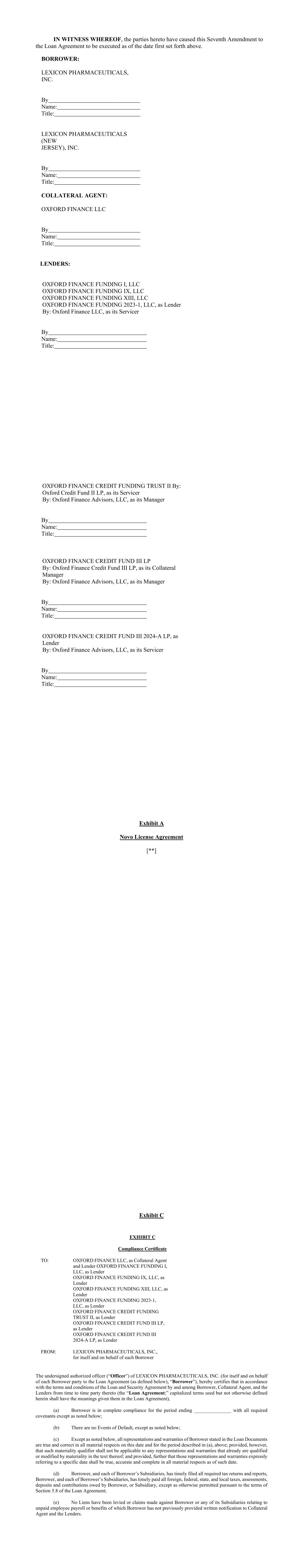 IN WITNESS WHEREOF, the parties hereto have caused this Seventh Amendment to the Loan Agreement to be executed as of the date first set forth above. BORROWER: LEXICON PHARMACEUTICALS, INC. By Name: Title: LEXICON PHARMACEUTICALS (NEW JERSEY), INC. By Name: Title: COLLATERAL AGENT: OXFORD FINANCE LLC By Name: Title: LENDERS: OXFORD FINANCE FUNDING I, LLC OXFORD FINANCE FUNDING IX, LLC OXFORD FINANCE FUNDING XIII, LLC OXFORD FINANCE FUNDING 2023-1, LLC, as Lender By: Oxford Finance LLC, as its Servicer By Name: Title: OXFORD FINANCE CREDIT FUNDING TRUST II By: Oxford Credit Fund II LP, as its Servicer By: Oxford Finance Advisors, LLC, as its Manager By Name: Title: OXFORD FINANCE CREDIT FUND III LP By: Oxford Finance Credit Fund III LP, as its Collateral Manager By: Oxford Finance Advisors, LLC, as its Manager By Name: Title: OXFORD FINANCE CREDIT FUND III 2024-A LP, as Lender By: Oxford Finance Advisors, LLC, as its Servicer By Name: Title: Exhibit A Novo License Agreement [**] Exhibit C EXHIBIT C Compliance Certificate TO: OXFORD FINANCE LLC, as Collateral Agent and Lender OXFORD FINANCE FUNDING I, LLC, as Lender OXFORD FINANCE FUNDING IX, LLC, as Lender OXFORD FINANCE FUNDING XIII, LLC, as Lender OXFORD FINANCE FUNDING 2023-1, LLC, as Lender OXFORD FINANCE CREDIT FUNDING TRUST II, as Lender OXFORD FINANCE CREDIT FUND III LP, as Lender OXFORD FINANCE CREDIT FUND III 2024-A LP, as Lender FROM: LEXICON PHARMACEUTICALS, INC., for itself and on behalf of each Borrower The undersigned authorized officer (“Officer”) of LEXICON PHARMACEUTICALS, INC. (for itself and on behalf of each Borrower party to the Loan Agreement (as defined below), “Borrower”), hereby certifies that in accordance with the terms and conditions of the Loan and Security Agreement by and among Borrower, Collateral Agent, and the Lenders from time to time party thereto (the “Loan Agreement;” capitalized terms used but not otherwise defined herein shall have the meanings given them in the Loan Agreement), (a) Borrower is in complete compliance for the period ending _______________ with all required covenants except as noted below; (b) There are no Events of Default, except as noted below; (c) Except as noted below, all representations and warranties of Borrower stated in the Loan Documents are true and correct in all material respects on this date and for the period described in (a), above; provided, however, that such materiality qualifier shall not be applicable to any representations and warranties that already are qualified or modified by materiality in the text thereof; and provided, further that those representations and warranties expressly referring to a specific date shall be true, accurate and complete in all material respects as of such date. (d) Borrower, and each of Borrower’s Subsidiaries, has timely filed all required tax returns and reports, Borrower, and each of Borrower’s Subsidiaries, has timely paid all foreign, federal, state, and local taxes, assessments, deposits and contributions owed by Borrower, or Subsidiary, except as otherwise permitted pursuant to the terms of Section 5.8 of the Loan Agreement; (e) No Liens have been levied or claims made against Borrower or any of its Subsidiaries relating to unpaid employee payroll or benefits of which Borrower has not previously provided written notification to Collateral Agent and the Lenders.