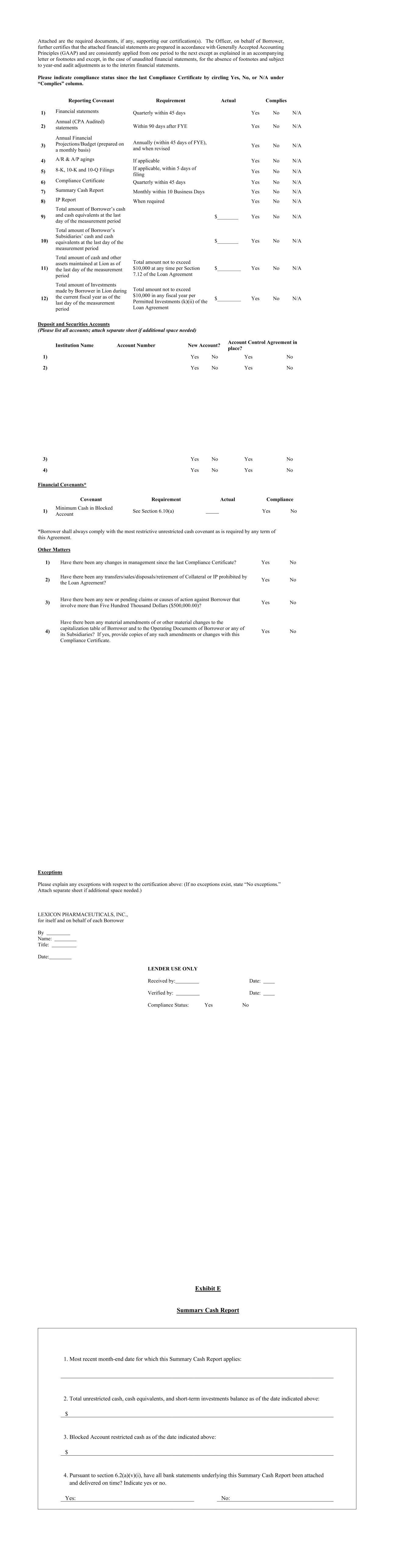 Attached are the required documents, if any, supporting our certification(s). The Officer, on behalf of Borrower, further certifies that the attached financial statements are prepared in accordance with Generally Accepted Accounting Principles (GAAP) and are consistently applied from one period to the next except as explained in an accompanying letter or footnotes and except, in the case of unaudited financial statements, for the absence of footnotes and subject to year-end audit adjustments as to the interim financial statements. Please indicate compliance status since the last Compliance Certificate by circling Yes, No, or N/A under “Complies” column. Reporting Covenant Requirement Actual Complies 1) Financial statements Quarterly within 45 days Yes No N/A 2) Annual (CPA Audited) statements Within 90 days after FYE Yes No N/A 3) Annual Financial Projections/Budget (prepared on a monthly basis) Annually (within 45 days of FYE), and when revised Yes No N/A 4) A/R & A/P agings If applicable Yes No N/A 5) 8-K, 10-K and 10-Q Filings If applicable, within 5 days of filing Yes No N/A 6) Compliance Certificate Quarterly within 45 days Yes No N/A 7) Summary Cash Report Monthly within 10 Business Days Yes No N/A 8) IP Report When required Yes No N/A 9) Total amount of Borrower’s cash and cash equivalents at the last day of the measurement period $________ Yes No N/A 10) Total amount of Borrower’s Subsidiaries’ cash and cash equivalents at the last day of the measurement period $________ Yes No N/A 11) Total amount of cash and other assets maintained at Lion as of the last day of the measurement period Total amount not to exceed $10,000 at any time per Section 7.12 of the Loan Agreement $_________ Yes No N/A 12) Total amount of Investments made by Borrower in Lion during the current fiscal year as of the last day of the measurement period Total amount not to exceed $10,000 in any fiscal year per Permitted Investments (k)(ii) of the Loan Agreement $_________ Yes No N/A Deposit and Securities Accounts (Please list all accounts; attach separate sheet if additional space needed) Institution Name Account Number New Account? Account Control Agreement in place? 1) Yes No Yes No 2) Yes No Yes No 3) Yes No Yes No 4) Yes No Yes No Financial Covenants* Covenant Requirement Actual Compliance 1) Minimum Cash in Blocked Account See Section 6.10(a) Yes No *Borrower shall always comply with the most restrictive unrestricted cash covenant as is required by any term of this Agreement. Other Matters 1) Have there been any changes in management since the last Compliance Certificate? Yes No 2) Have there been any transfers/sales/disposals/retirement of Collateral or IP prohibited by the Loan Agreement? Yes No 3) Have there been any new or pending claims or causes of action against Borrower that involve more than Five Hundred Thousand Dollars ($500,000.00)? Yes No 4) Have there been any material amendments of or other material changes to the capitalization table of Borrower and to the Operating Documents of Borrower or any of its Subsidiaries? If yes, provide copies of any such amendments or changes with this Compliance Certificate. Yes No Exceptions Please explain any exceptions with respect to the certification above: (If no exceptions exist, state “No exceptions.” Attach separate sheet if additional space needed.) LEXICON PHARMACEUTICALS, INC., for itself and on behalf of each Borrower By Name: Title: Date: LENDER USE ONLY Received by: Date: Verified by: Date: Compliance Status: Yes No Exhibit E Summary Cash Report 1. Most recent month-end date for which this Summary Cash Report applies: 2. Total unrestricted cash, cash equivalents, and short-term investments balance as of the date indicated above: $ 3. Blocked Account restricted cash as of the date indicated above: $ 4. Pursuant to section 6.2(a)(v)(i), have all bank statements underlying this Summary Cash Report been attached and delivered on time? Indicate yes or no. Yes: No: