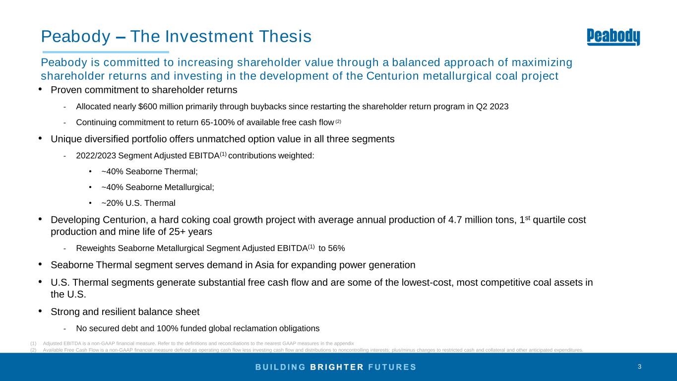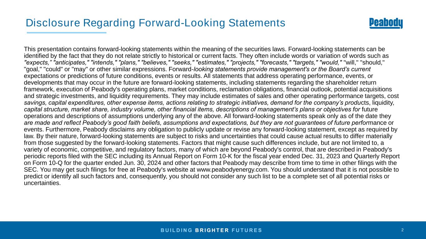 2 Disclosure Regarding Forward-Looking Statements This presentation contains forward-looking statements within the meaning of the securities laws. Forward-looking statements can be identified by the fact that they do not relate strictly to historical or current facts. They often include words or variation of words such as "expects,” "anticipates," "intends," "plans," "believes," "seeks," "estimates," "projects," "forecasts," "targets," "would," "will," "should," "goal," "could" or "may" or other similar expressions. Forward-looking statements provide management's or the Board’s current expectations or predictions of future conditions, events or results. All statements that address operating performance, events, or developments that may occur in the future are forward-looking statements, including statements regarding the shareholder return framework, execution of Peabody's operating plans, market conditions, reclamation obligations, financial outlook, potential acquisitions and strategic investments, and liquidity requirements. They may include estimates of sales and other operating performance targets, cost savings, capital expenditures, other expense items, actions relating to strategic initiatives, demand for the company’s products, liquidity, capital structure, market share, industry volume, other financial items, descriptions of management’s plans or objectives for future operations and descriptions of assumptions underlying any of the above. All forward-looking statements speak only as of the date they are made and reflect Peabody’s good faith beliefs, assumptions and expectations, but they are not guarantees of future performance or events. Furthermore, Peabody disclaims any obligation to publicly update or revise any forward-looking statement, except as required by law. By their nature, forward-looking statements are subject to risks and uncertainties that could cause actual results to differ materially from those suggested by the forward-looking statements. Factors that might cause such differences include, but are not limited to, a variety of economic, competitive, and regulatory factors, many of which are beyond Peabody's control, that are described in Peabody's periodic reports filed with the SEC including its Annual Report on Form 10-K for the fiscal year ended Dec. 31, 2023 and Quarterly Report on Form 10-Q for the quarter ended Jun. 30, 2024 and other factors that Peabody may describe from time to time in other filings with the SEC. You may get such filings for free at Peabody's website at www.peabodyenergy.com. You should understand that it is not possible to predict or identify all such factors and, consequently, you should not consider any such list to be a complete set of all potential risks or uncertainties.