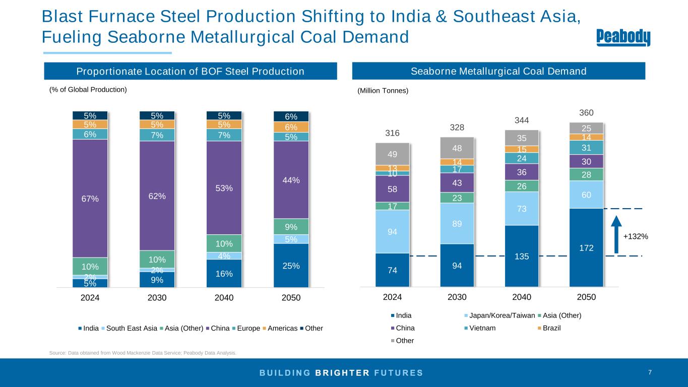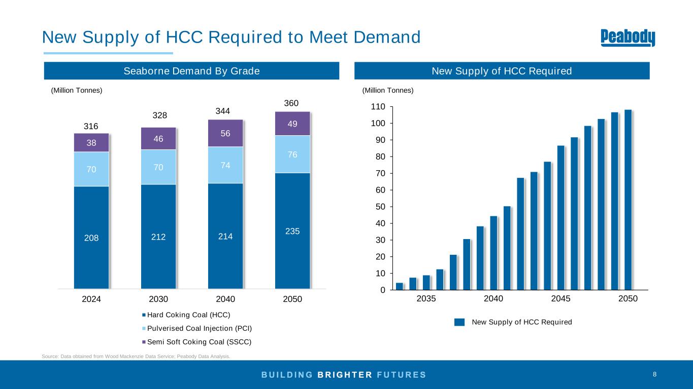 7 Blast Furnace Steel Production Shifting to India & Southeast Asia, Fueling Seaborne Metallurgical Coal Demand Seaborne Metallurgical Coal Demand (Million Tonnes) +132% Proportionate Location of BOF Steel Production (% of Global Production) 74 94 135 172 94 89 73 60 17 23 26 28 58 43 36 30 10 17 24 31 13 14 15 14 49 48 35 25 316 328 344 360 2024 2030 2040 2050 India Japan/Korea/Taiwan Asia (Other) China Vietnam Brazil Other Source: Data obtained from Wood Mackenzie Data Service; Peabody Data Analysis. 5% 9% 16% 25% 2% 2% 4% 5% 10% 10% 10% 9% 67% 62% 53% 44% 6% 7% 7% 5% 5% 5% 5% 6% 5% 5% 5% 6% 2024 2030 2040 2050 India South East Asia Asia (Other) China Europe Americas Other