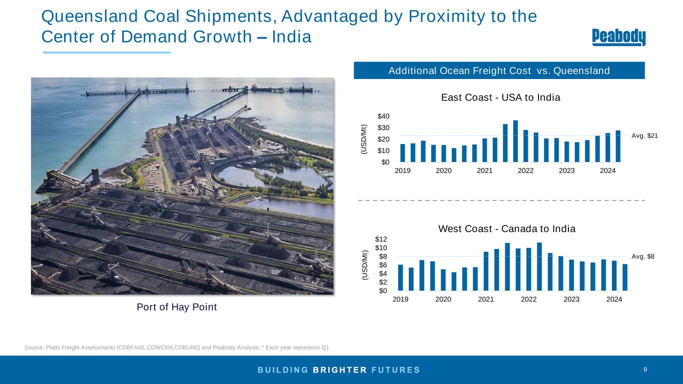 8 New Supply of HCC Required to Meet Demand Source: Data obtained from Wood Mackenzie Data Service; Peabody Data Analysis. (Million Tonnes) Seaborne Demand By Grade 208 212 214 235 70 70 74 76 38 46 56 49316 328 344 360 2024 2030 2040 2050 Hard Coking Coal (HCC) Pulverised Coal Injection (PCI) Semi Soft Coking Coal (SSCC) (Million Tonnes) 0 10 20 30 40 50 60 70 80 90 100 110 2035 2040 2045 2050 New Supply of HCC Required New Supply of HCC Required