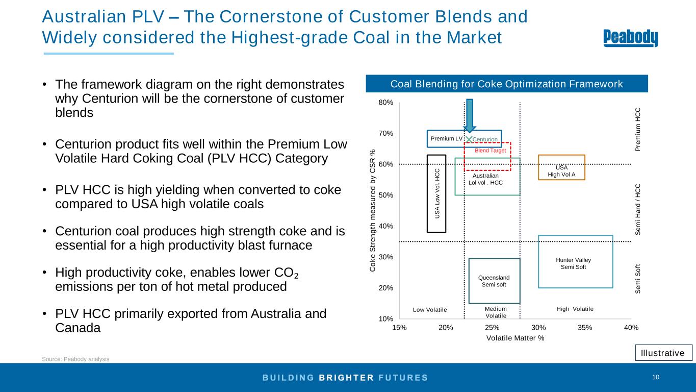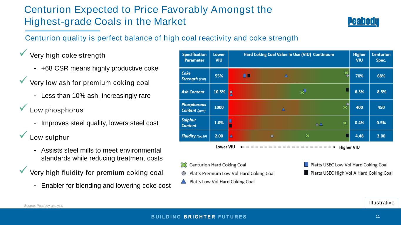 10 Australian PLV – The Cornerstone of Customer Blends and Widely considered the Highest-grade Coal in the Market 10% 20% 30% 40% 50% 60% 70% 80% 15% 20% 25% 30% 35% 40% C o k e S tr e n g th m e a s u re d b y C S R % Volatile Matter % Coal Blending for Coke Optimization Framework USA High Vol A Hunter Valley Semi Soft Queensland Semi soft U S A L o w V o l. H C C Premium LV Centurion Australian Lol vol . HCC Blend Target P re m iu m H C C S e m i H a rd / H C C S e m i S o ft Low Volatile Medium Volatile High Volatile Illustrative Source: Peabody analysis • The framework diagram on the right demonstrates why Centurion will be the cornerstone of customer blends • Centurion product fits well within the Premium Low Volatile Hard Coking Coal (PLV HCC) Category • PLV HCC is high yielding when converted to coke compared to USA high volatile coals • Centurion coal produces high strength coke and is essential for a high productivity blast furnace • High productivity coke, enables lower CO₂ emissions per ton of hot metal produced • PLV HCC primarily exported from Australia and Canada