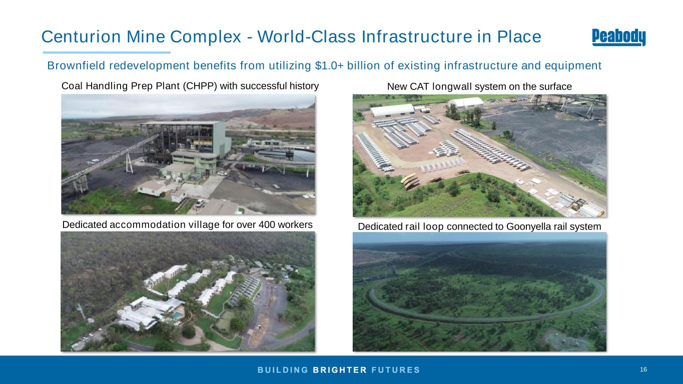 15 Centurion South Development Meters to LW Coal Production (Km) 2024: 4.1 2025: 18.1 2026: 3.5 Reserves 20 million tons LOM Production ~3.8 million saleable tons average per year Centurion Project Summary – Development KPI’s Project Map Centurion North Development Meters to LW Coal Production (Km) 2025: 5.1 2026: 7.2 2027: 11.1 2028: 18.9 Reserves 121 million tons LOM Production ~4.8 million saleable tons average per year Centurion South Centurion North
