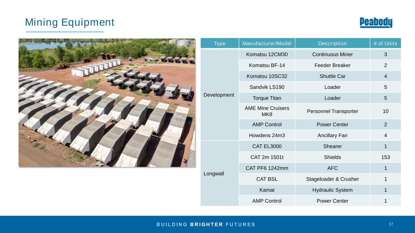 17 Mining Equipment Type Manufacturer/Model Description # of Units Development Komatsu 12CM30 Continuous Miner 3 Komatsu BF-14 Feeder Breaker 2 Komatsu 10SC32 Shuttle Car 4 Sandvik LS190 Loader 5 Torque Titan Loader 5 AME Mine Cruisers MK8 Personnel Transporter 10 AMP Control Power Center 2 Howdens 24m3 Ancillary Fan 4 Longwall CAT EL3000 Shearer 1 CAT 2m 1501t Shields 153 CAT PF6 1242mm AFC 1 CAT BSL Stageloader & Crusher 1 Kamat Hydraulic System 1 AMP Control Power Center 1