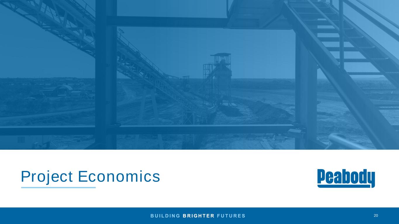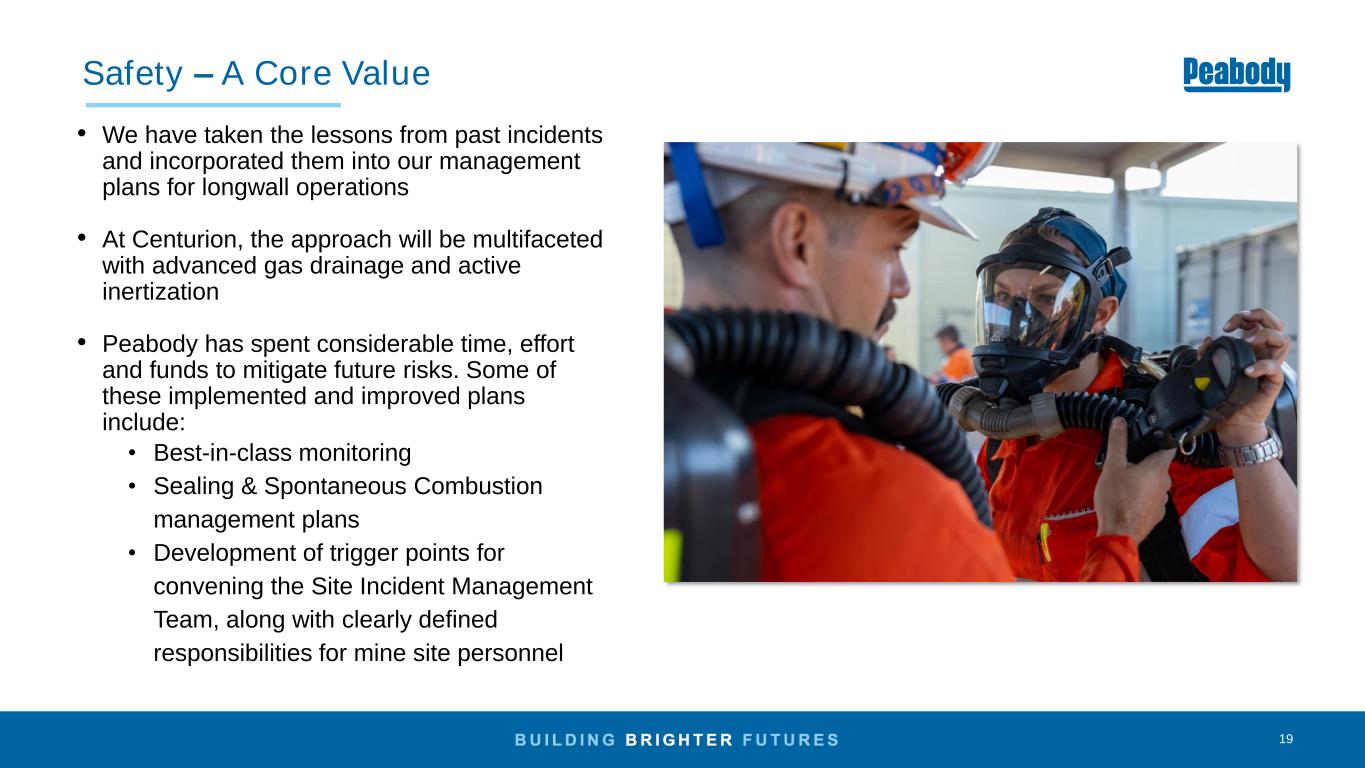 19 Safety – A Core Value • We have taken the lessons from past incidents and incorporated them into our management plans for longwall operations • At Centurion, the approach will be multifaceted with advanced gas drainage and active inertization • Peabody has spent considerable time, effort and funds to mitigate future risks. Some of these implemented and improved plans include: • Best-in-class monitoring • Sealing & Spontaneous Combustion management plans • Development of trigger points for convening the Site Incident Management Team, along with clearly defined responsibilities for mine site personnel