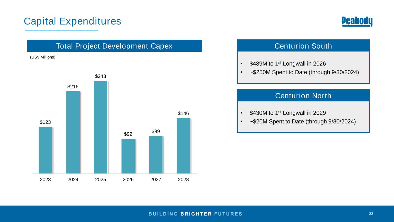 23 Capital Expenditures $123 $216 $243 $92 $99 $146 2023 2024 2025 2026 2027 2028 Centurion South • $489M to 1st Longwall in 2026 • ~$250M Spent to Date (through 9/30/2024) Centurion North • $430M to 1st Longwall in 2029 • ~$20M Spent to Date (through 9/30/2024) Total Project Development Capex (US$ Millions)