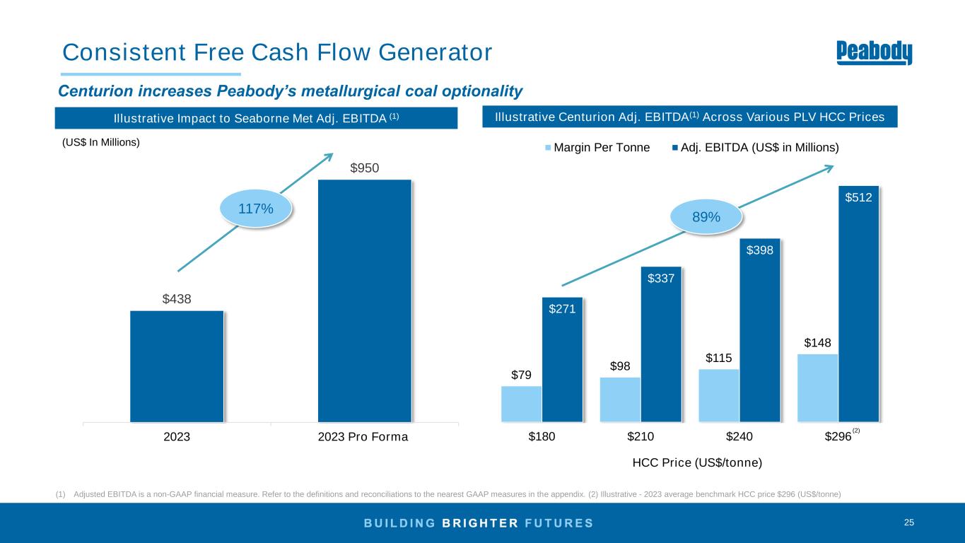 24 Centurion Transforms Peabody’s Seaborne Metallurgical Coal Segment Metallurgical Sales By GradeMetallurgical Coal Sales 2023 2026E 30% 34% 16% 13% 7% PCI Premium LV HCC High Vol A AUS Low Vol HCC Other 6.9 11.6 2023 2023 Pro Forma LOM Average (Million Tons) (1) 2023 Pro forma with LOM average of 4.7 million tons +68% (1) 60% 6% 24% 10% PCI Premium LV HCC High Vol A AUS Low Vol HCC Other