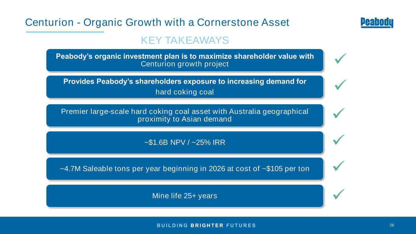 25 Consistent Free Cash Flow Generator Illustrative Impact to Seaborne Met Adj. EBITDA (1) Illustrative Centurion Adj. EBITDA(1) Across Various PLV HCC Prices (1) Adjusted EBITDA is a non-GAAP financial measure. Refer to the definitions and reconciliations to the nearest GAAP measures in the appendix. (2) Illustrative - 2023 average benchmark HCC price $296 (US$/tonne) HCC Price (US$/tonne) $438 $950 2023 2023 Pro Forma (US$ In Millions) Centurion increases Peabody’s metallurgical coal optionality 117% 89% $79 $98 $115 $148 $271 $337 $398 $512 $180 $210 $240 $296 Margin Per Tonne Adj. EBITDA (US$ in Millions) 89% (2)