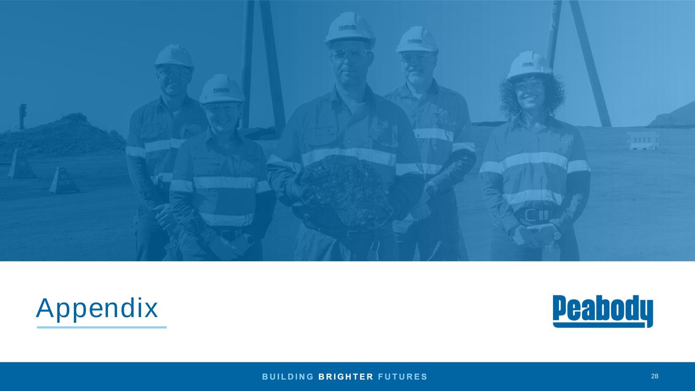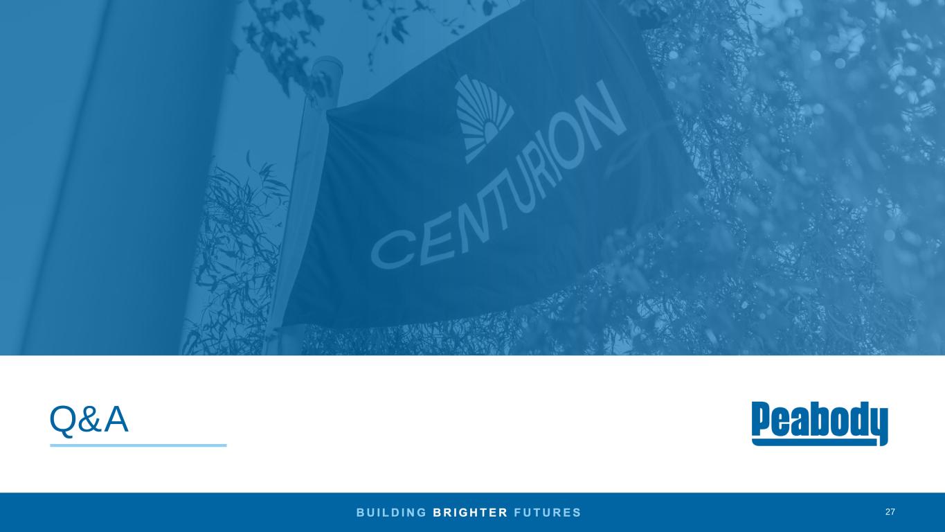 26 KEY TAKEAWAYS Peabody’s organic investment plan is to maximize shareholder value with Centurion growth project Provides Peabody’s shareholders exposure to increasing demand for hard coking coal Premier large-scale hard coking coal asset with Australia geographical proximity to Asian demand ~$1.6B NPV / ~25% IRR ~4.7M Saleable tons per year beginning in 2026 at cost of ~$105 per ton Mine life 25+ years Centurion - Organic Growth with a Cornerstone Asset