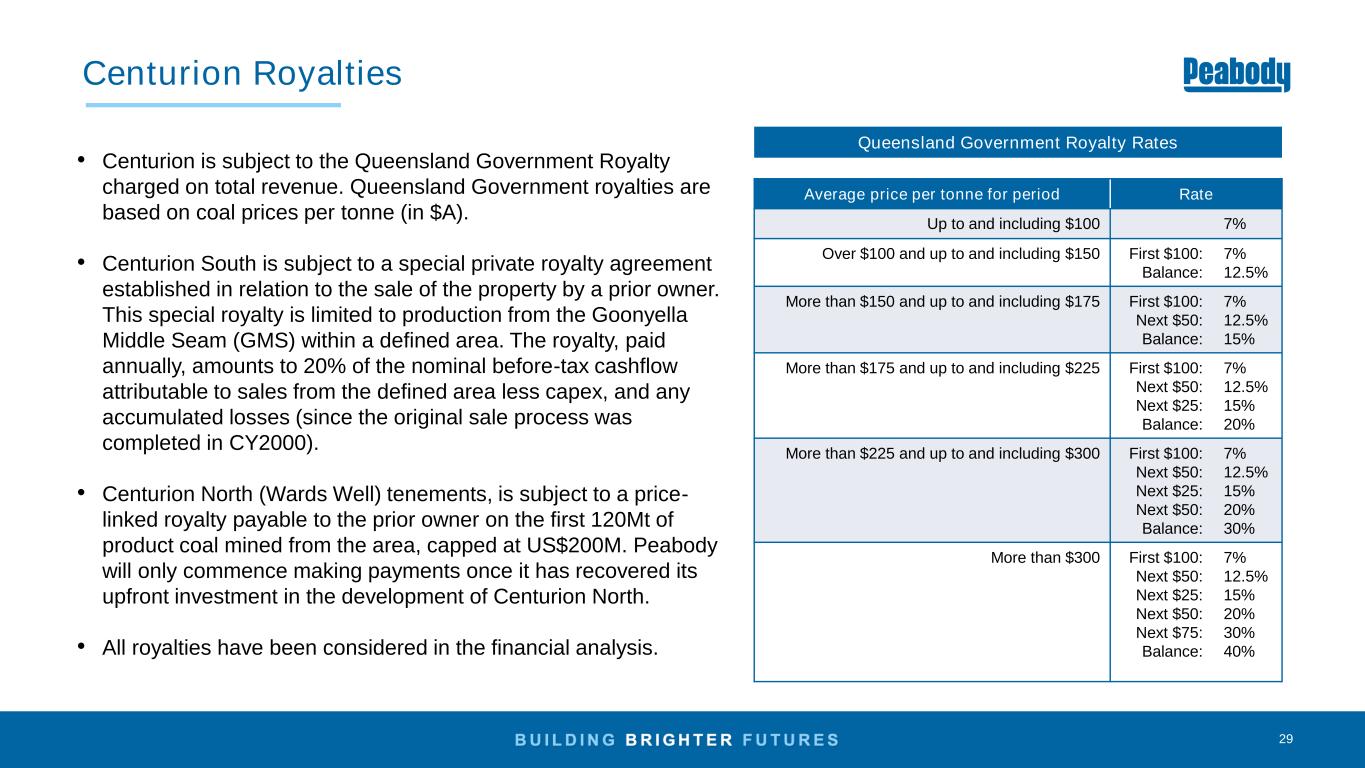 29 Centurion Royalties • Centurion is subject to the Queensland Government Royalty charged on total revenue. Queensland Government royalties are based on coal prices per tonne (in $A). • Centurion South is subject to a special private royalty agreement established in relation to the sale of the property by a prior owner. This special royalty is limited to production from the Goonyella Middle Seam (GMS) within a defined area. The royalty, paid annually, amounts to 20% of the nominal before-tax cashflow attributable to sales from the defined area less capex, and any accumulated losses (since the original sale process was completed in CY2000). • Centurion North (Wards Well) tenements, is subject to a price- linked royalty payable to the prior owner on the first 120Mt of product coal mined from the area, capped at US$200M. Peabody will only commence making payments once it has recovered its upfront investment in the development of Centurion North. • All royalties have been considered in the financial analysis. Average price per tonne for period Rate Up to and including $100 7% Over $100 and up to and including $150 First $100: Balance: 7% 12.5% More than $150 and up to and including $175 First $100: Next $50: Balance: 7% 12.5% 15% More than $175 and up to and including $225 First $100: Next $50: Next $25: Balance: 7% 12.5% 15% 20% More than $225 and up to and including $300 First $100: Next $50: Next $25: Next $50: Balance: 7% 12.5% 15% 20% 30% More than $300 First $100: Next $50: Next $25: Next $50: Next $75: Balance: 7% 12.5% 15% 20% 30% 40% Queensland Government Royalty Rates