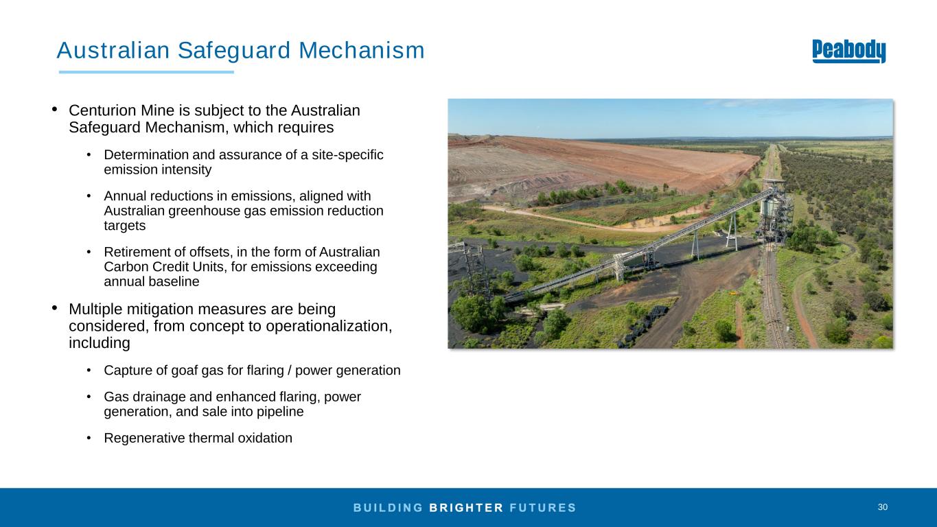 30 Australian Safeguard Mechanism • Centurion Mine is subject to the Australian Safeguard Mechanism, which requires • Determination and assurance of a site-specific emission intensity • Annual reductions in emissions, aligned with Australian greenhouse gas emission reduction targets • Retirement of offsets, in the form of Australian Carbon Credit Units, for emissions exceeding annual baseline • Multiple mitigation measures are being considered, from concept to operationalization, including • Capture of goaf gas for flaring / power generation • Gas drainage and enhanced flaring, power generation, and sale into pipeline • Regenerative thermal oxidation