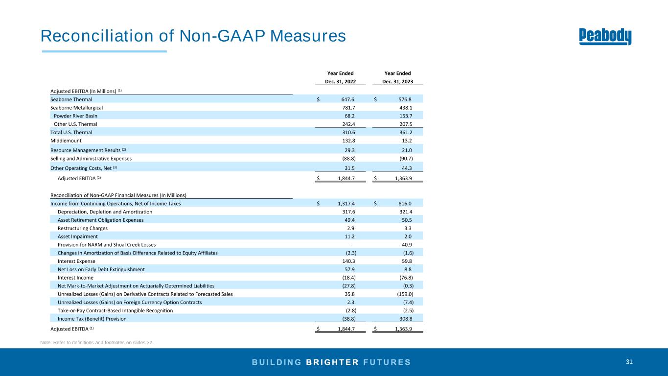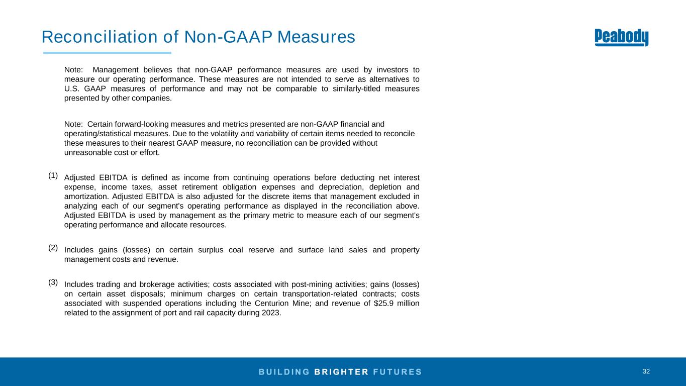 31 Reconciliation of Non-GAAP Measures Note: Refer to definitions and footnotes on slides 32. Year Ended Year Ended Dec. 31, 2022 Dec. 31, 2023 Adjusted EBITDA (In Millions) (1) Seaborne Thermal $ 647.6 $ 576.8 Seaborne Metallurgical 781.7 438.1 Powder River Basin 68.2 153.7 Other U.S. Thermal 242.4 207.5 Total U.S. Thermal 310.6 361.2 Middlemount 132.8 13.2 Resource Management Results (2) 29.3 21.0 Selling and Administrative Expenses (88.8) (90.7) Other Operating Costs, Net (3) 31.5 44.3 Adjusted EBITDA (2) $ 1,844.7 $ 1,363.9 Reconciliation of Non-GAAP Financial Measures (In Millions) Income from Continuing Operations, Net of Income Taxes $ 1,317.4 $ 816.0 Depreciation, Depletion and Amortization 317.6 321.4 Asset Retirement Obligation Expenses 49.4 50.5 Restructuring Charges 2.9 3.3 Asset Impairment 11.2 2.0 Provision for NARM and Shoal Creek Losses - 40.9 Changes in Amortization of Basis Difference Related to Equity Affiliates (2.3) (1.6) Interest Expense 140.3 59.8 Net Loss on Early Debt Extinguishment 57.9 8.8 Interest Income (18.4) (76.8) Net Mark-to-Market Adjustment on Actuarially Determined Liabilities (27.8) (0.3) Unrealized Losses (Gains) on Derivative Contracts Related to Forecasted Sales 35.8 (159.0) Unrealized Losses (Gains) on Foreign Currency Option Contracts 2.3 (7.4) Take-or-Pay Contract-Based Intangible Recognition (2.8) (2.5) Income Tax (Benefit) Provision (38.8) 308.8 Adjusted EBITDA (1) $ 1,844.7 $ 1,363.9