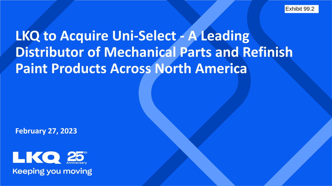 LKQ to Acquire Uni-Select - A Leading Distributor of Mechanical Parts and Refinish Paint Products Across North America February 27, 2023