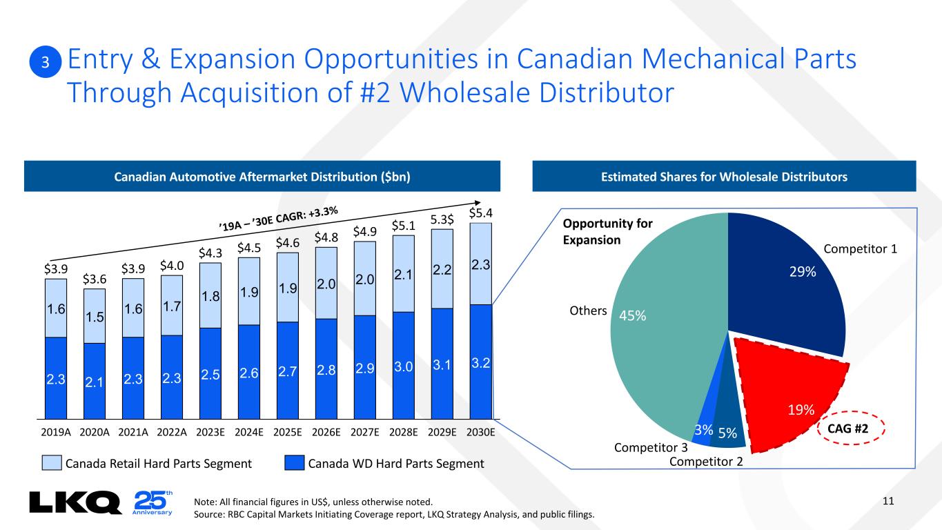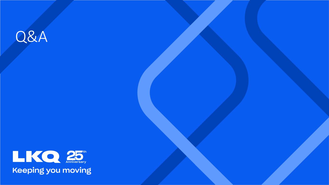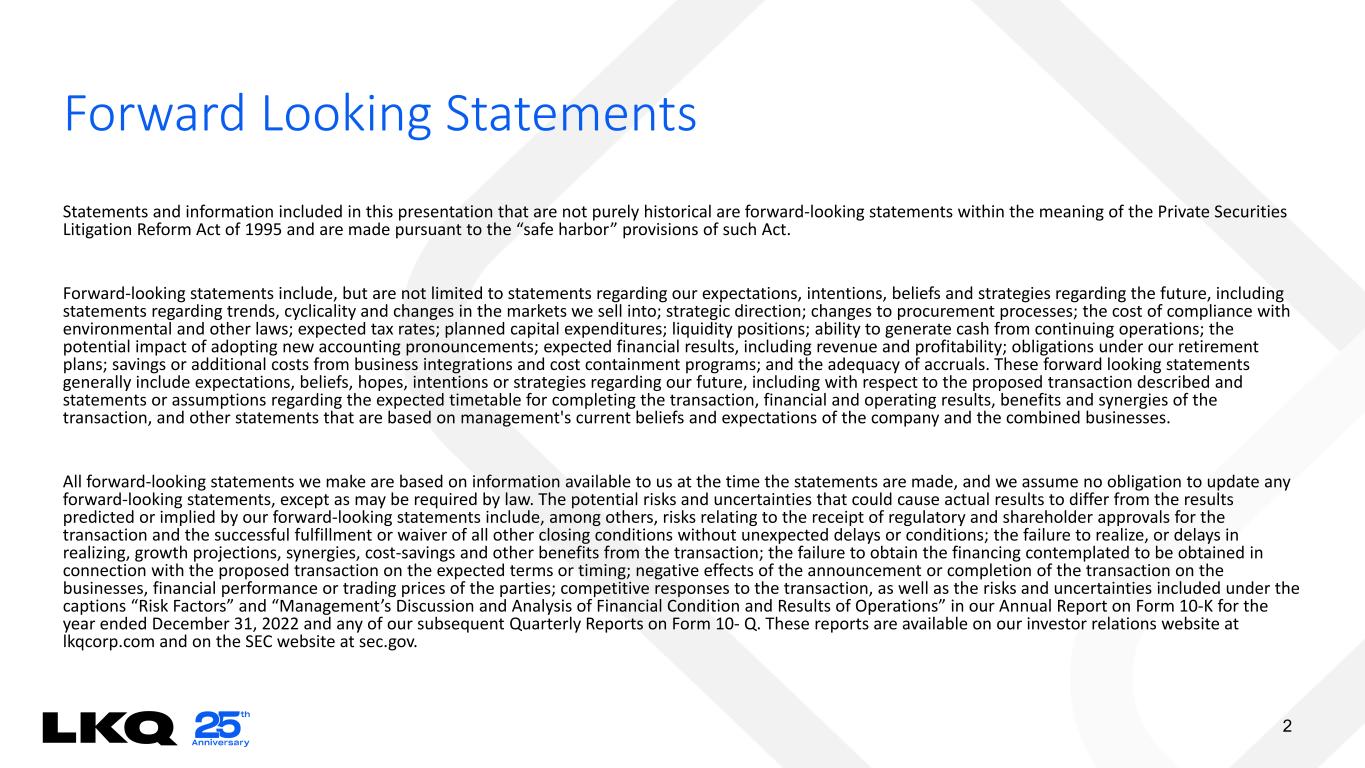 Forward Looking Statements Statements and information included in this presentation that are not purely historical are forward-looking statements within the meaning of the Private Securities Litigation Reform Act of 1995 and are made pursuant to the “safe harbor” provisions of such Act. Forward-looking statements include, but are not limited to statements regarding our expectations, intentions, beliefs and strategies regarding the future, including statements regarding trends, cyclicality and changes in the markets we sell into; strategic direction; changes to procurement processes; the cost of compliance with environmental and other laws; expected tax rates; planned capital expenditures; liquidity positions; ability to generate cash from continuing operations; the potential impact of adopting new accounting pronouncements; expected financial results, including revenue and profitability; obligations under our retirement plans; savings or additional costs from business integrations and cost containment programs; and the adequacy of accruals. These forward looking statements generally include expectations, beliefs, hopes, intentions or strategies regarding our future, including with respect to the proposed transaction described and statements or assumptions regarding the expected timetable for completing the transaction, financial and operating results, benefits and synergies of the transaction, and other statements that are based on management's current beliefs and expectations of the company and the combined businesses. All forward-looking statements we make are based on information available to us at the time the statements are made, and we assume no obligation to update any forward-looking statements, except as may be required by law. The potential risks and uncertainties that could cause actual results to differ from the results predicted or implied by our forward-looking statements include, among others, risks relating to the receipt of regulatory and shareholder approvals for the transaction and the successful fulfillment or waiver of all other closing conditions without unexpected delays or conditions; the failure to realize, or delays in realizing, growth projections, synergies, cost-savings and other benefits from the transaction; the failure to obtain the financing contemplated to be obtained in connection with the proposed transaction on the expected terms or timing; negative effects of the announcement or completion of the transaction on the businesses, financial performance or trading prices of the parties; competitive responses to the transaction, as well as the risks and uncertainties included under the captions “Risk Factors” and “Management’s Discussion and Analysis of Financial Condition and Results of Operations” in our Annual Report on Form 10-K for the year ended December 31, 2022 and any of our subsequent Quarterly Reports on Form 10- Q. These reports are available on our investor relations website at lkqcorp.com and on the SEC website at sec.gov. 2