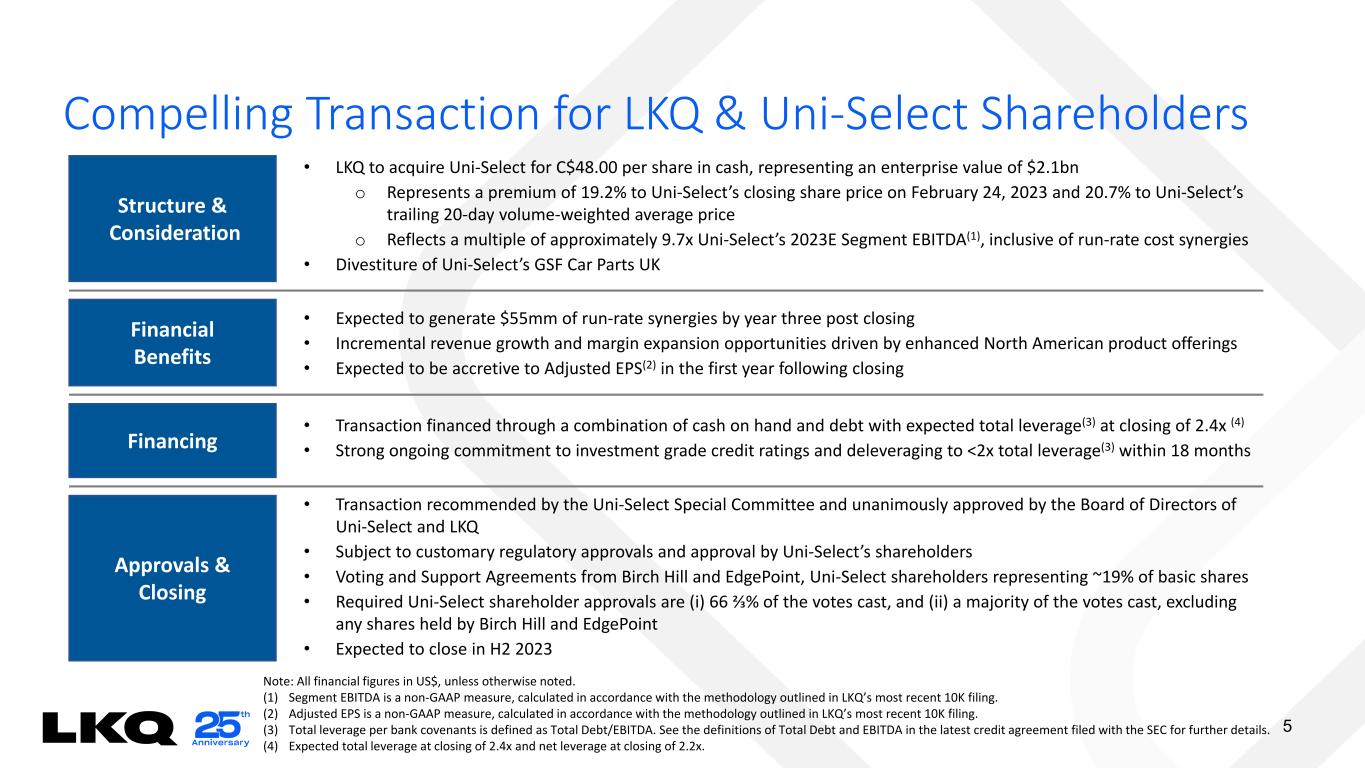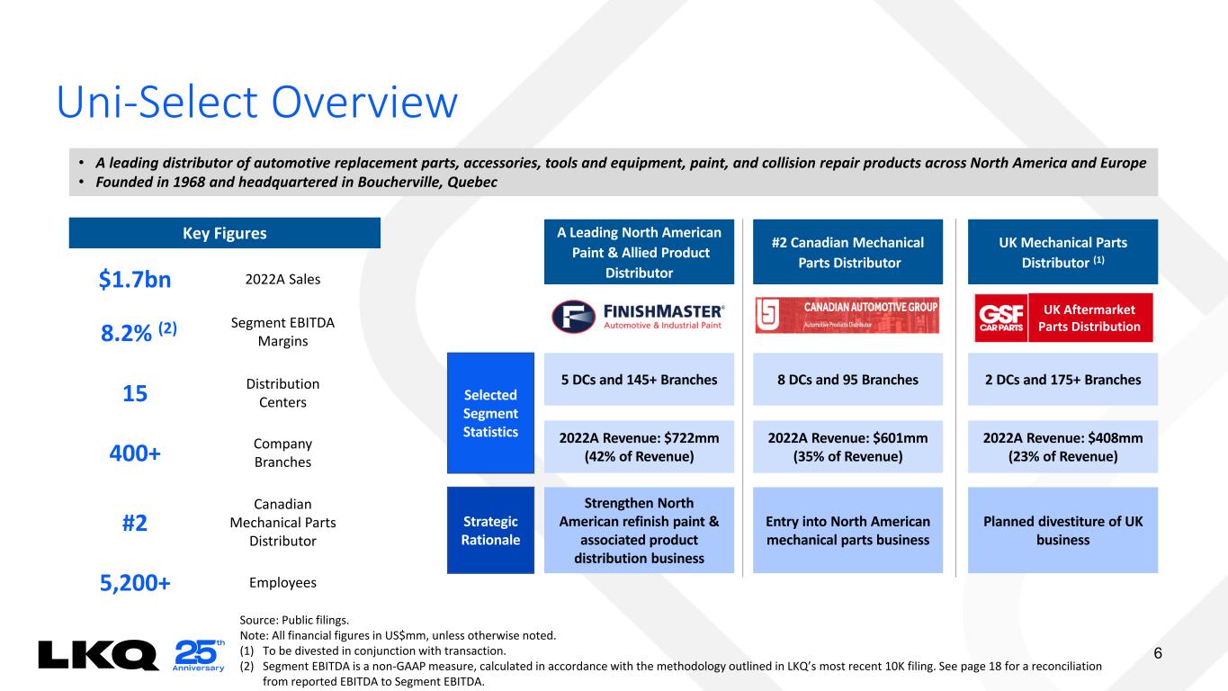 Compelling Transaction for LKQ & Uni-Select Shareholders Note: All financial figures in US$, unless otherwise noted. (1) Segment EBITDA is a non-GAAP measure, calculated in accordance with the methodology outlined in LKQ’s most recent 10K filing. (2) Adjusted EPS is a non-GAAP measure, calculated in accordance with the methodology outlined in LKQ’s most recent 10K filing. (3) Total leverage per bank covenants is defined as Total Debt/EBITDA. See the definitions of Total Debt and EBITDA in the latest credit agreement filed with the SEC for further details. (4) Expected total leverage at closing of 2.4x and net leverage at closing of 2.2x. 5 Structure & Consideration Approvals & Closing • LKQ to acquire Uni-Select for C$48.00 per share in cash, representing an enterprise value of $2.1bn o Represents a premium of 19.2% to Uni-Select’s closing share price on February 24, 2023 and 20.7% to Uni-Select’s trailing 20-day volume-weighted average price o Reflects a multiple of approximately 9.7x Uni-Select’s 2023E Segment EBITDA(1), inclusive of run-rate cost synergies • Divestiture of Uni-Select’s GSF Car Parts UK Financial Benefits • Expected to generate $55mm of run-rate synergies by year three post closing • Incremental revenue growth and margin expansion opportunities driven by enhanced North American product offerings • Expected to be accretive to Adjusted EPS(2) in the first year following closing Financing • Transaction financed through a combination of cash on hand and debt with expected total leverage(3) at closing of 2.4x (4) • Strong ongoing commitment to investment grade credit ratings and deleveraging to <2x total leverage(3) within 18 months • Transaction recommended by the Uni-Select Special Committee and unanimously approved by the Board of Directors of Uni-Select and LKQ • Subject to customary regulatory approvals and approval by Uni-Select’s shareholders • Voting and Support Agreements from Birch Hill and EdgePoint, Uni-Select shareholders representing ~19% of basic shares • Required Uni-Select shareholder approvals are (i) 66 ⅔% of the votes cast, and (ii) a majority of the votes cast, excluding any shares held by Birch Hill and EdgePoint • Expected to close in H2 2023